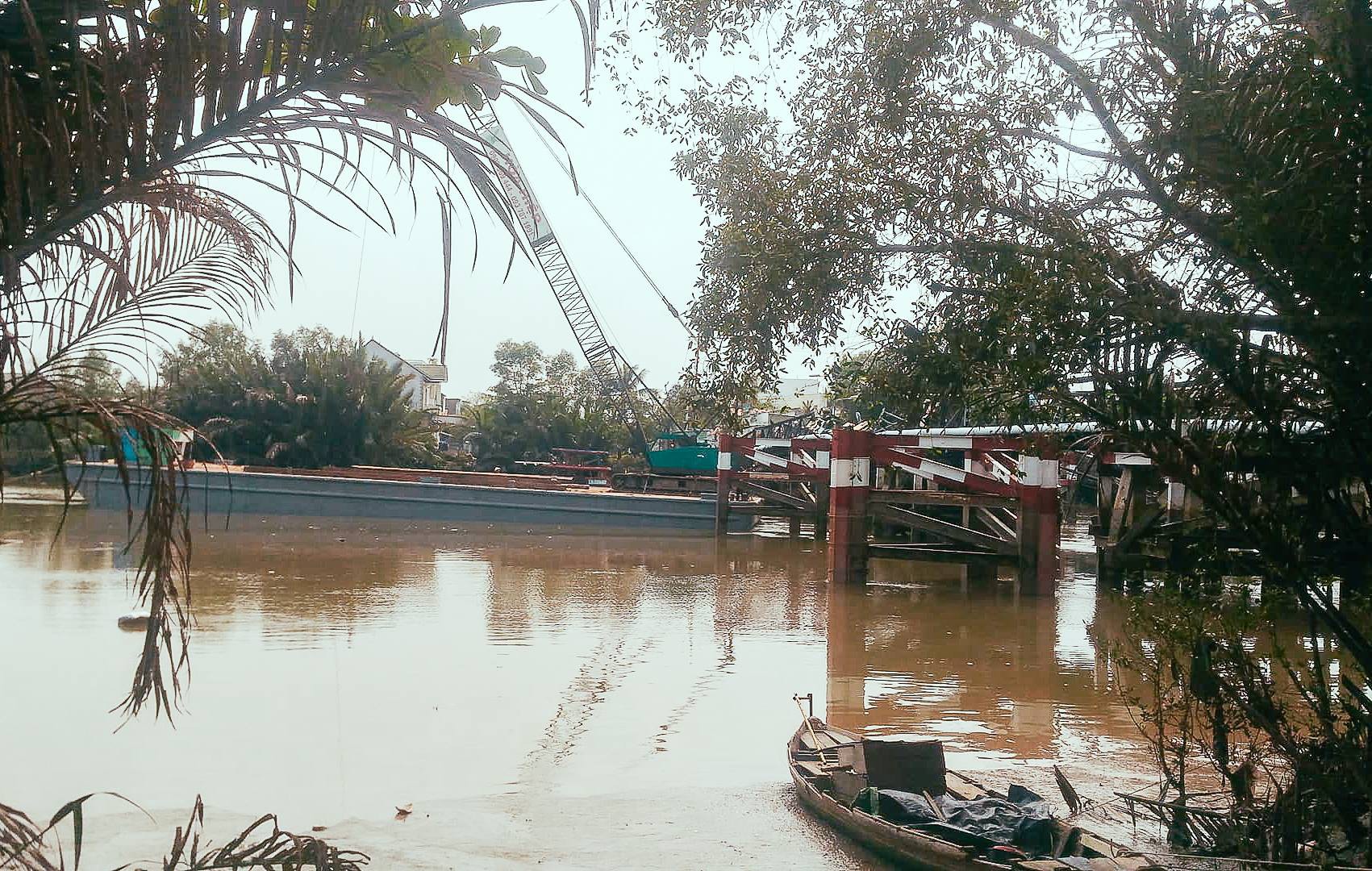 Hiện tại sà lan đã được đưa tới khu vực cầu bị sập để chuẩn bị vớt xe tải bị chìm xuống sông