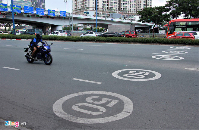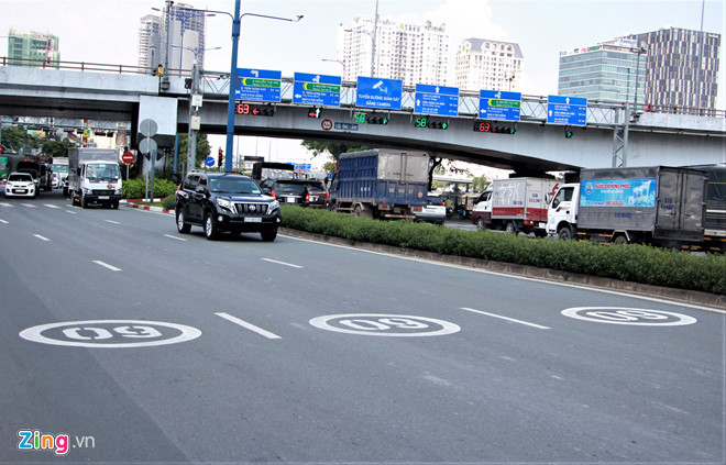 Đại diện Trung tâm Quản lý Đường hầm sông Sài Gòn (thuộc Sở Giao thông Vận tải) cho biết đường Mai Chí Thọ và Võ Văn Kiệt là 2 tuyến đầu tiên ở TP.HCM được sơn biển báo tốc độ trên mặt đường.