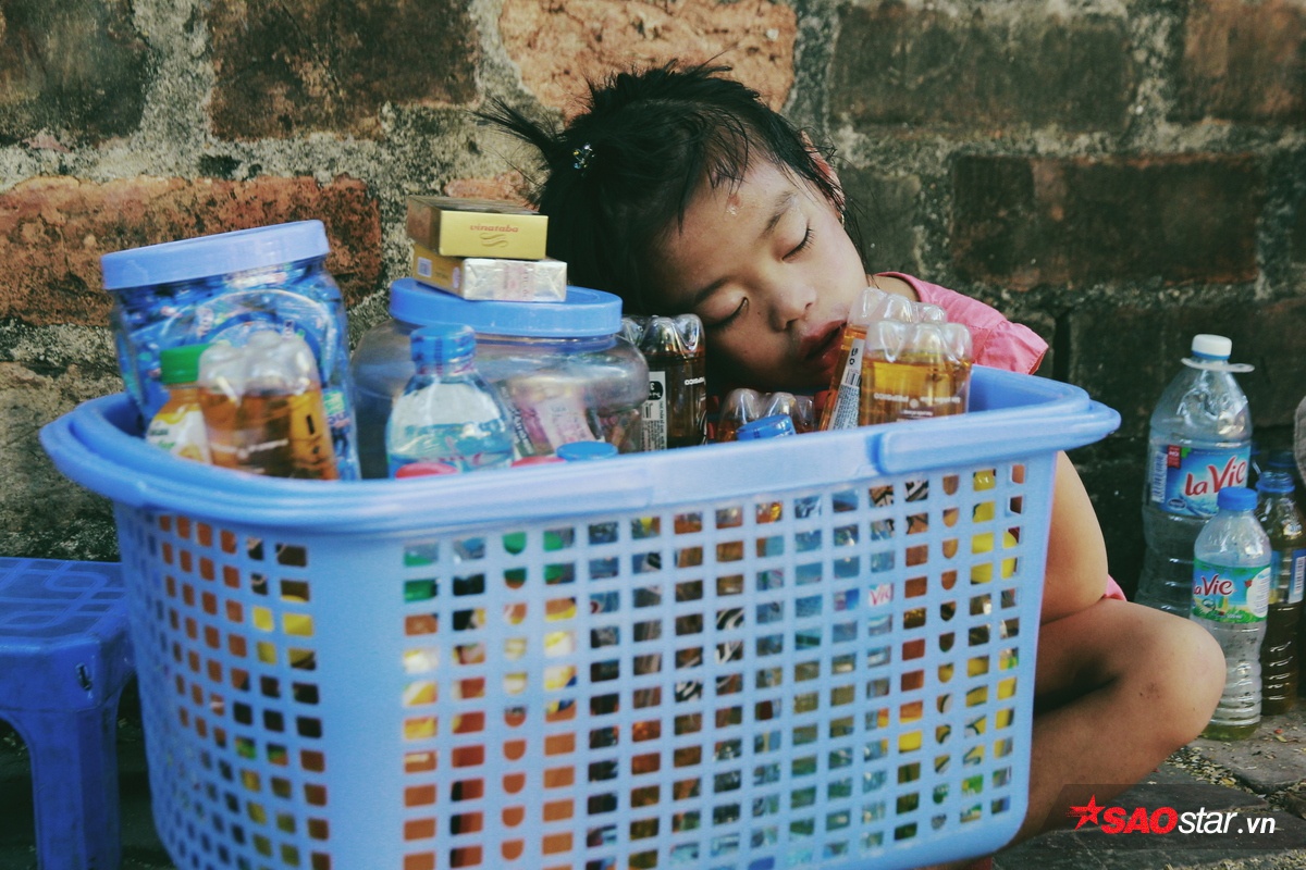 Một em bé say sưa ngủ bên quán trà của mẹ. Tuổi thơ em lớn lên bên gánh hàng nước và những giấc bên quán trà ven đường.