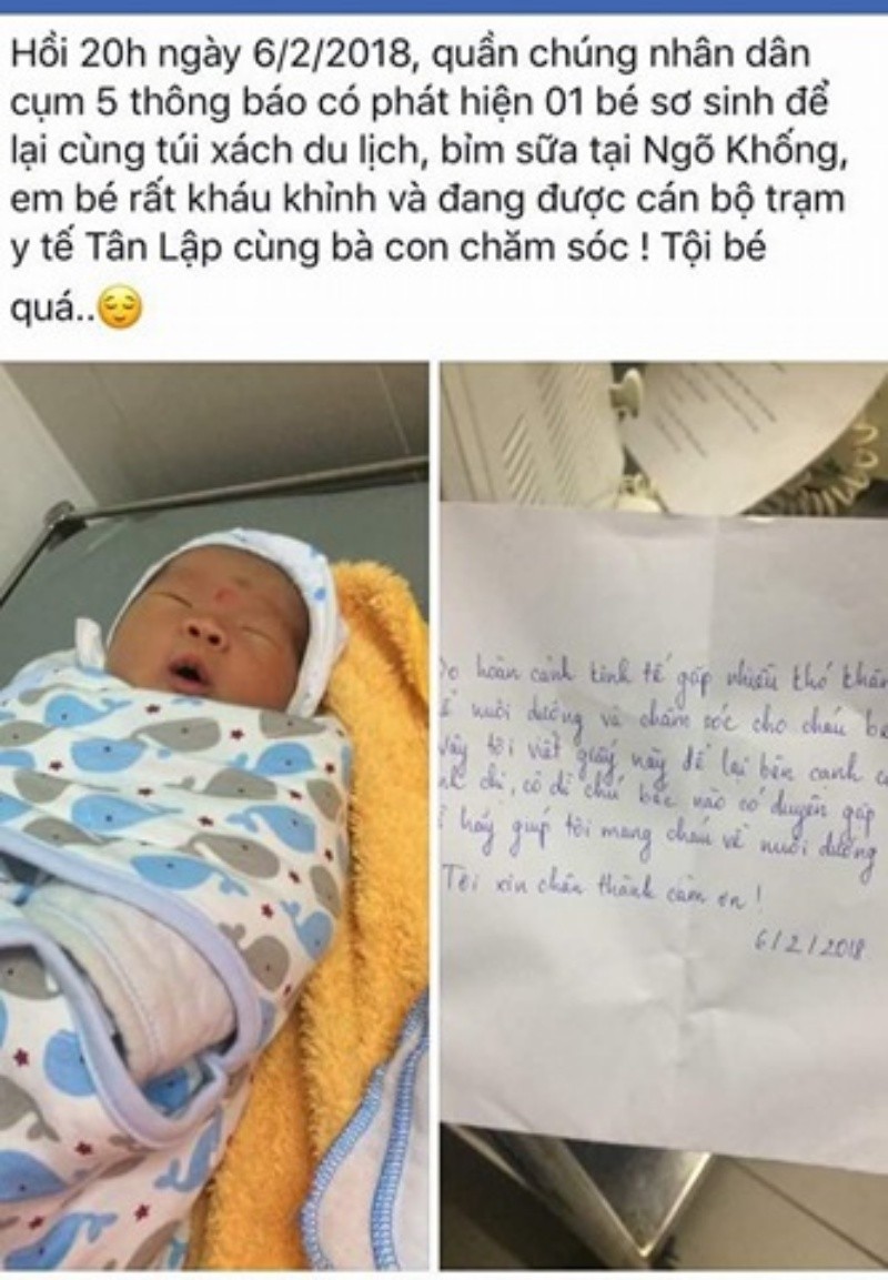 Mới đây, trên mạng xã hội xôn xao hình ảnh một bé sơ sinh bị bỏ rơi trong túi xách nhà dân. Theo đó, thông tin đăng tải với nội dung: “Hồi 20h ngày 6/2, quần chúng nhân dân cụm số 5 thông báo phát hiện một bé sơ sinh để lại cùng túi xách du lịch, bỉm sữa tại Ngõ Khống, em bé rất kháu khỉnh và đang được cán bộ y tế Tân Lập cùng bà con chăm sóc, tội bé quá”.