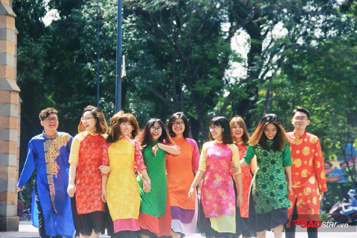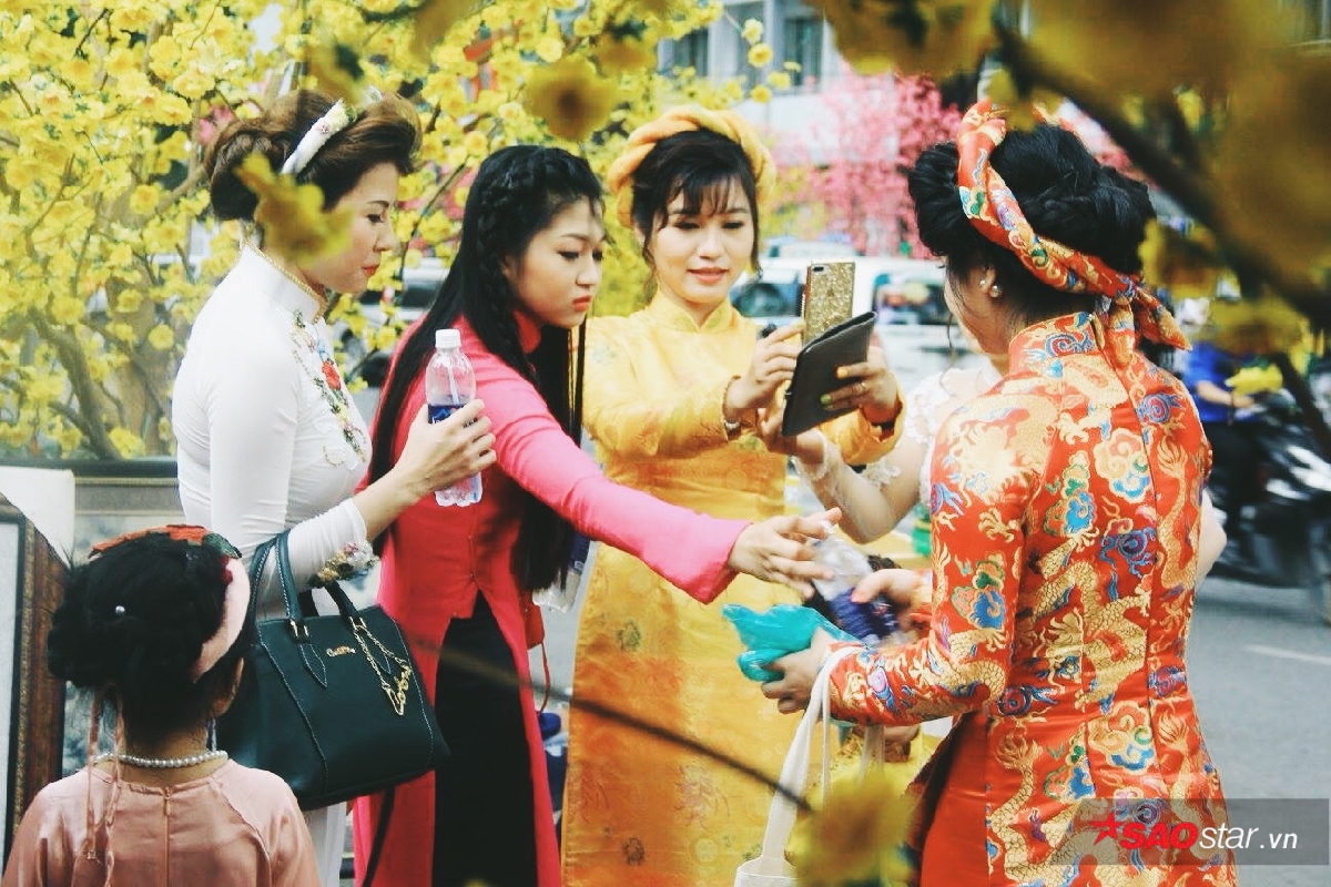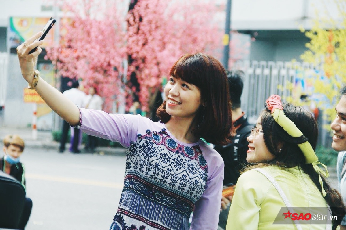 Sự đổ bộ của những tà áo dài cách tân lẫn truyền thống vào mùa Tết đã tạo cho con phố một diện mạo vô cùng rực rỡ. Những tà áo dài đủ màu sắc bay phấp phới trong gió xen lẫn trong không khí mùa xuân lại ai cũng rạng rỡ hơn. Nhiều nhóm bạn còn rủ nhau mặc “đồng phục áo dài” để khoe dáng bên cạnh những cành mai vàng. Theo như lời bạn Nguyên Vũ - một sinh viên chụp ảnh nhóm sáng nay chia sẻ : “Tết là dịp cả đám có cơ hội được diện đẹp rồi chụp ảnh với nhau nên ai cũng thích hết. Vừa có hình để “sống ảo” trên facebook lại vừa có kỷ niệm đẹp với bạn bè.”