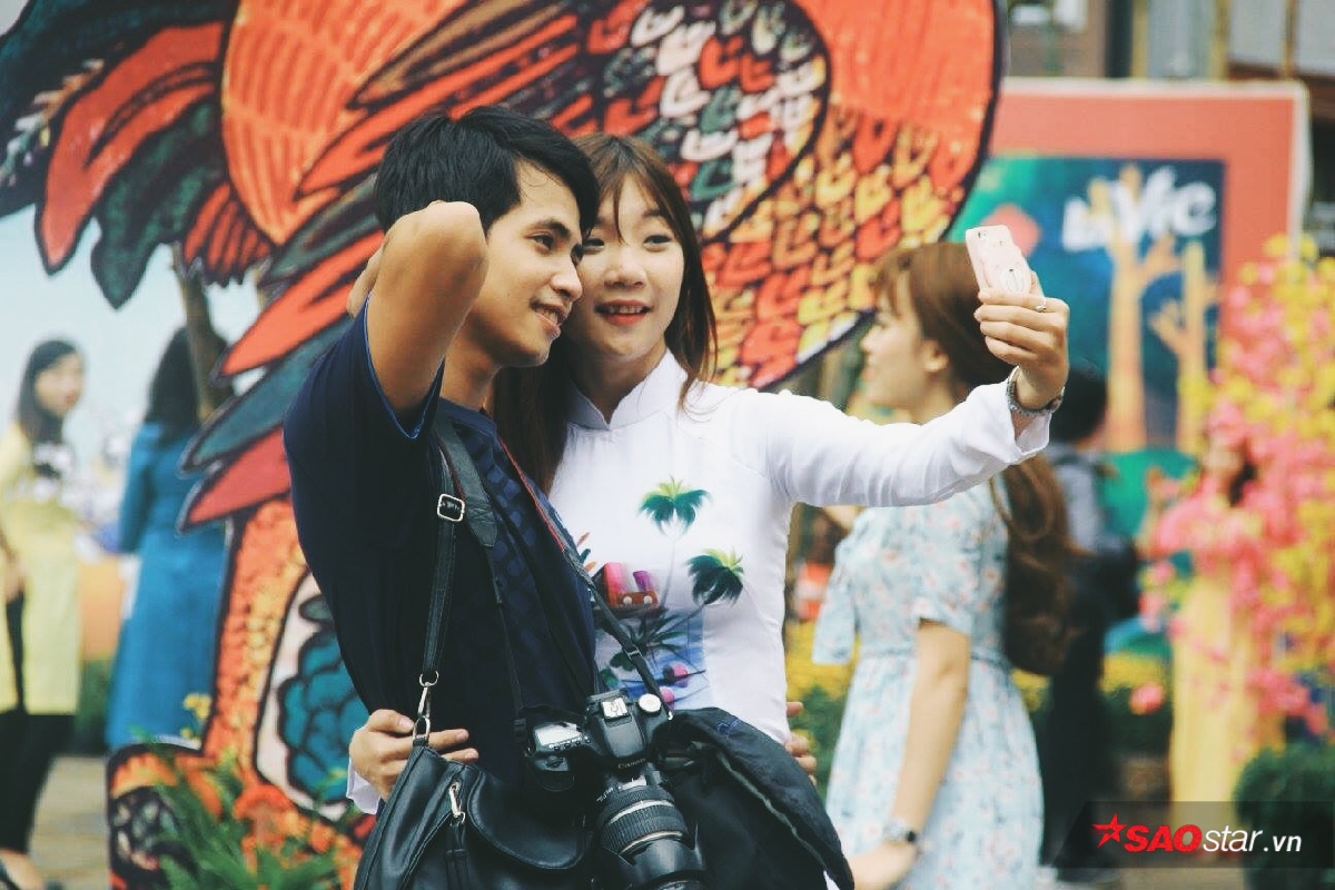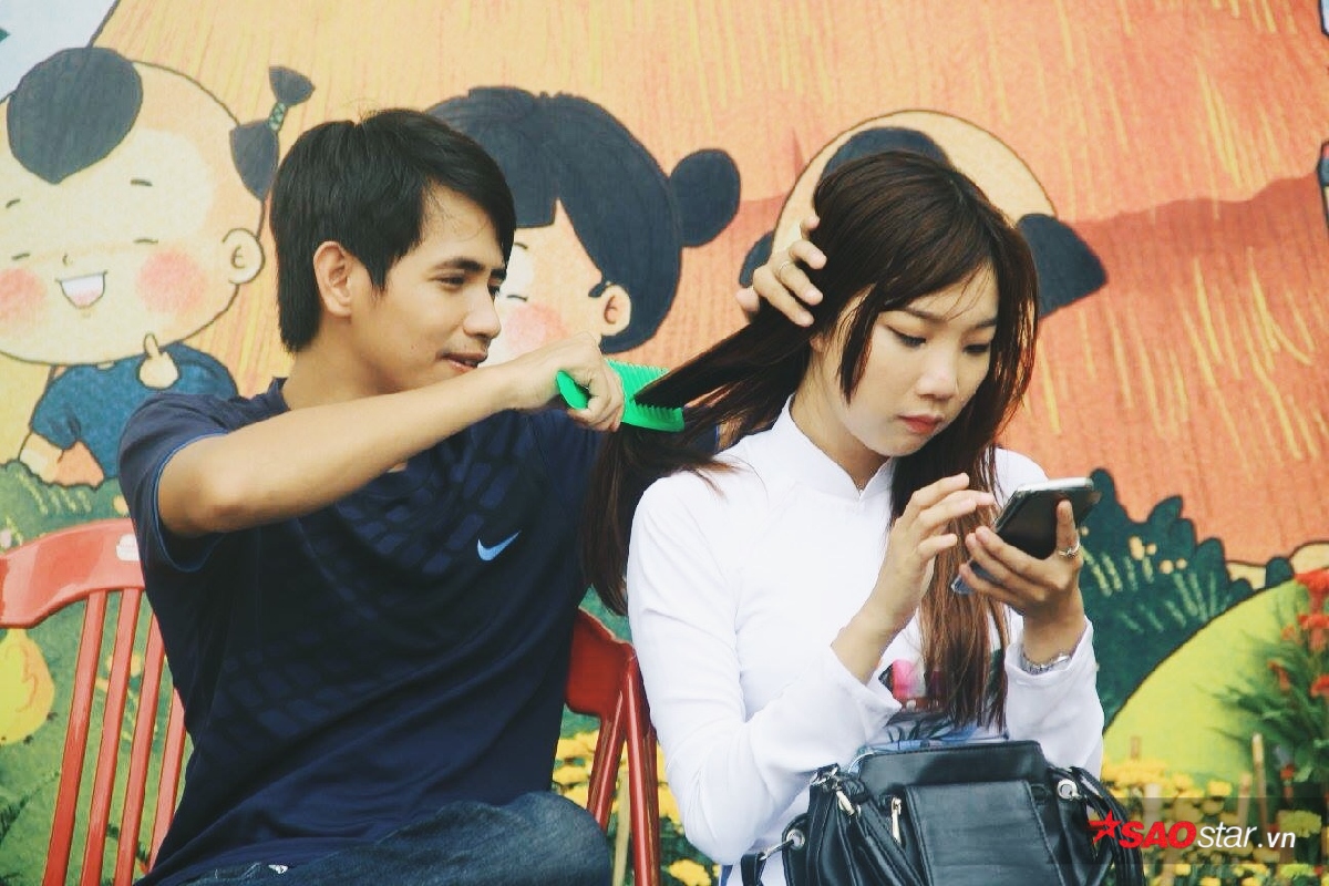 Tết cũng là dịp những cặp đôi sánh vai bên nhau để ghi lại những khoảnh khắc hạnh phúc. Có nhiều chàng trai còn ân cần chải tóc cho bạn gái mình trước khi chụp ảnh. Quả thật mùa xuân là mùa diệu kỳ nhất trong năm, bởi ai cũng thấy mình xinh đẹp, vui vẻ và an lành nhiều bên cạnh những người thương.