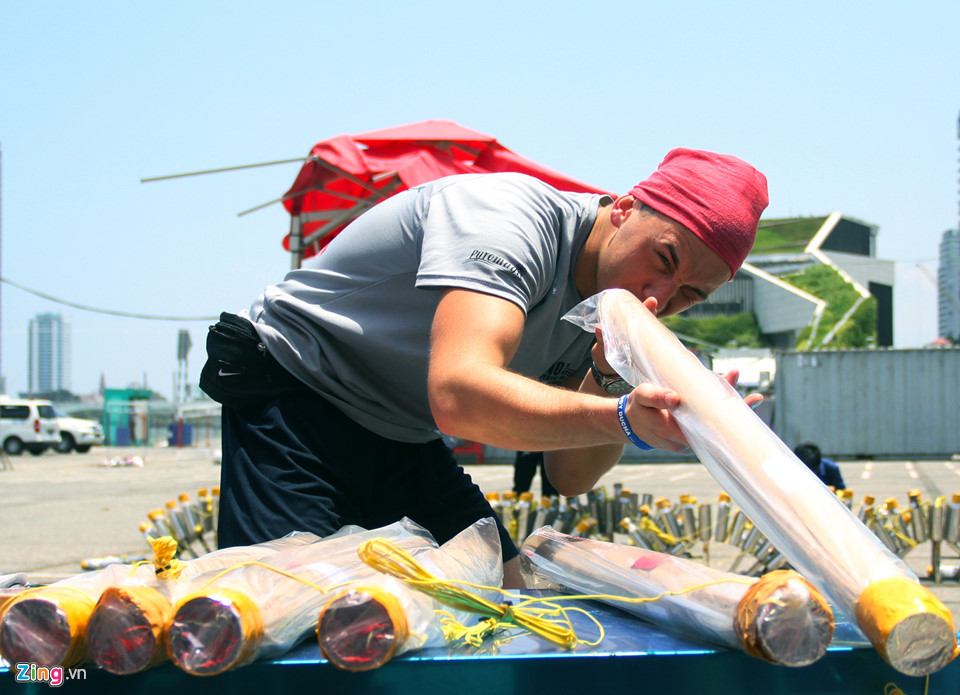Còn 3 ngày nữa, cuộc thi pháo hoa quốc tế 2018 sẽ diễn ra tại Đà Nẵng. Đêm khai mạc (30/4), đội chủ nhà Việt Nam và Ba Lan sẽ trình diễn trước. Tuy nhiên, sáng 27/4, công tác chuẩn bị của hai đội thi gần như hoàn tất. Anh Huỳnh Ngọc Chính - Đội trưởng đội pháo hoa của Việt Nam, cho biết năm nay đội tuyển sẽ sử dụng một giàn cao 60 m và có những hiệu ứng đặc biệt để tạo điểm nhấn.
