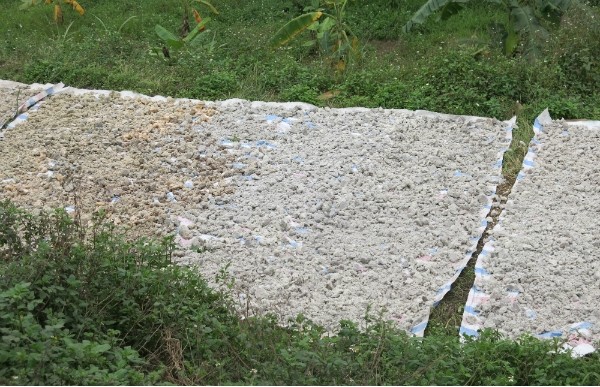Miến làm xong phơi trên nền cát bụi bẩn của công trình đang xây dựng dở.