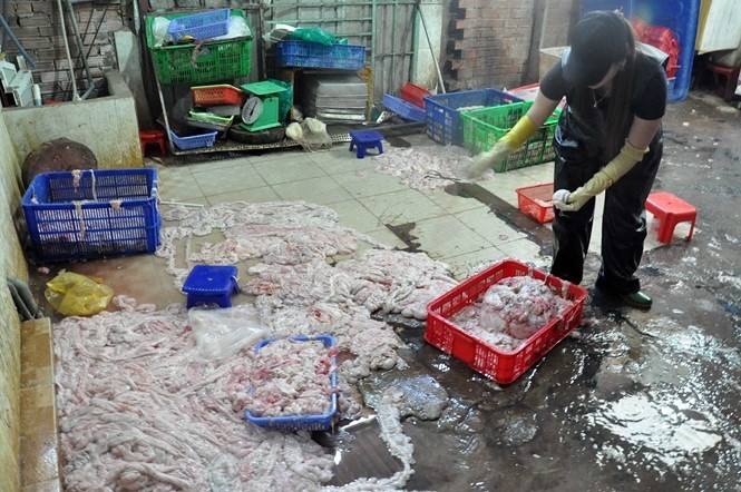 Quang cảnh chế biến lòng heo thối tại một cơ sở chế biến sản phẩm nội tạng động vật ở huyện Bình Chánh, TP. HCM