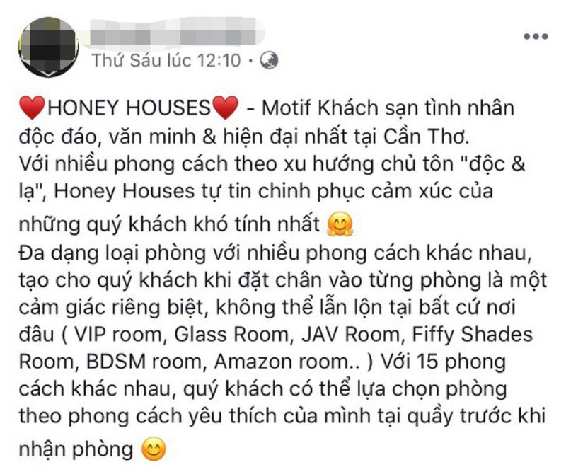 Cụ thể, ngày 3/8/2018, chủ nhân của khách sạn honey-houses, ở quận Bình Thủy, TP Cần Thơ đã đăng dòng quảng cáo lên facebook cá nhân với nội dung: “Mô típ khách sạn tình nhân độc đáo, văn minh và hiện đại nhất tại Cần Thơ. Với nhiều phong cách theo xu hướng chủ tôn “độc và lạ”, honey-houses tự tin chinh phục cảm xúc của những quý khách khó tính nhất. Đa dạng loại phòng với 15 phong cách khác nhau…”.