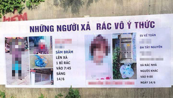Trên băng rôn là hình ảnh một bà lão 84 tuổi tên Q. đã lén xả một túi rác và một sinh viên Đại học tên N.T.T.L đặt túi rác trước cổng nhà người khác cùng vào sáng ngày 14/6.