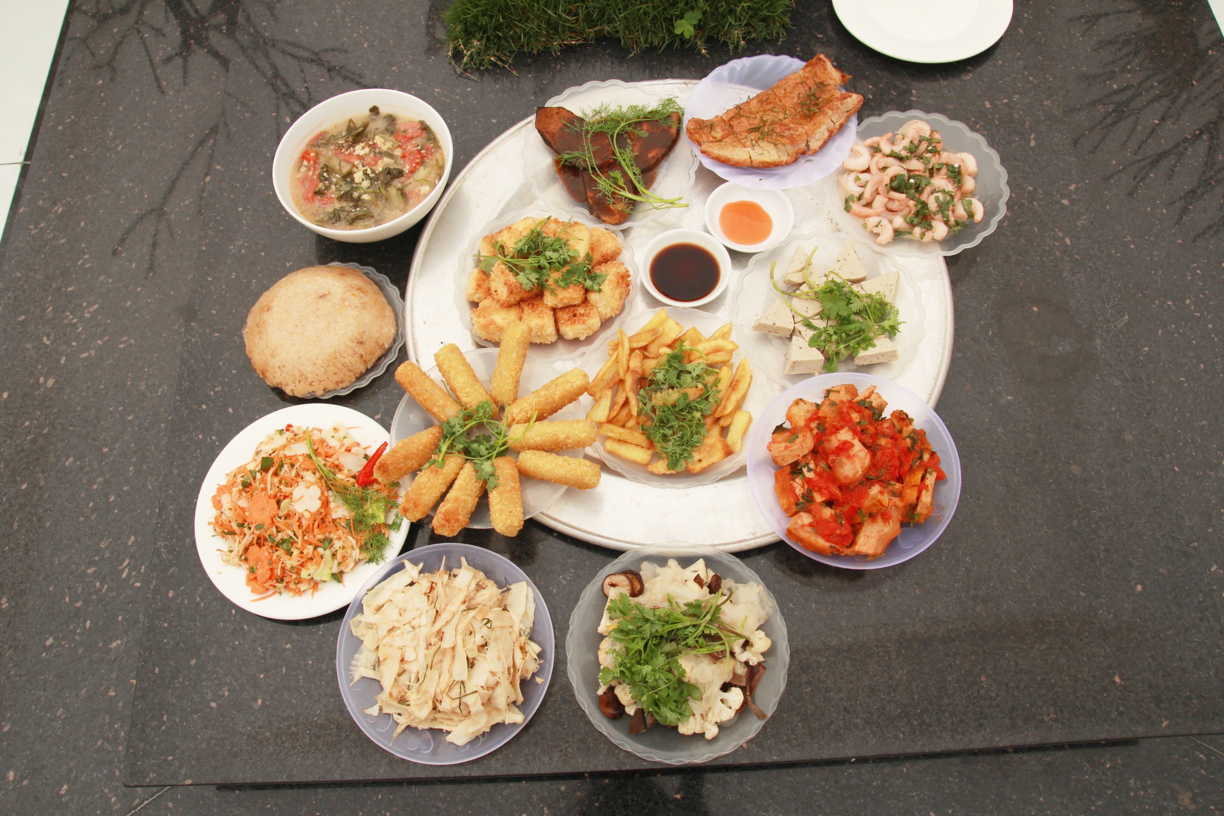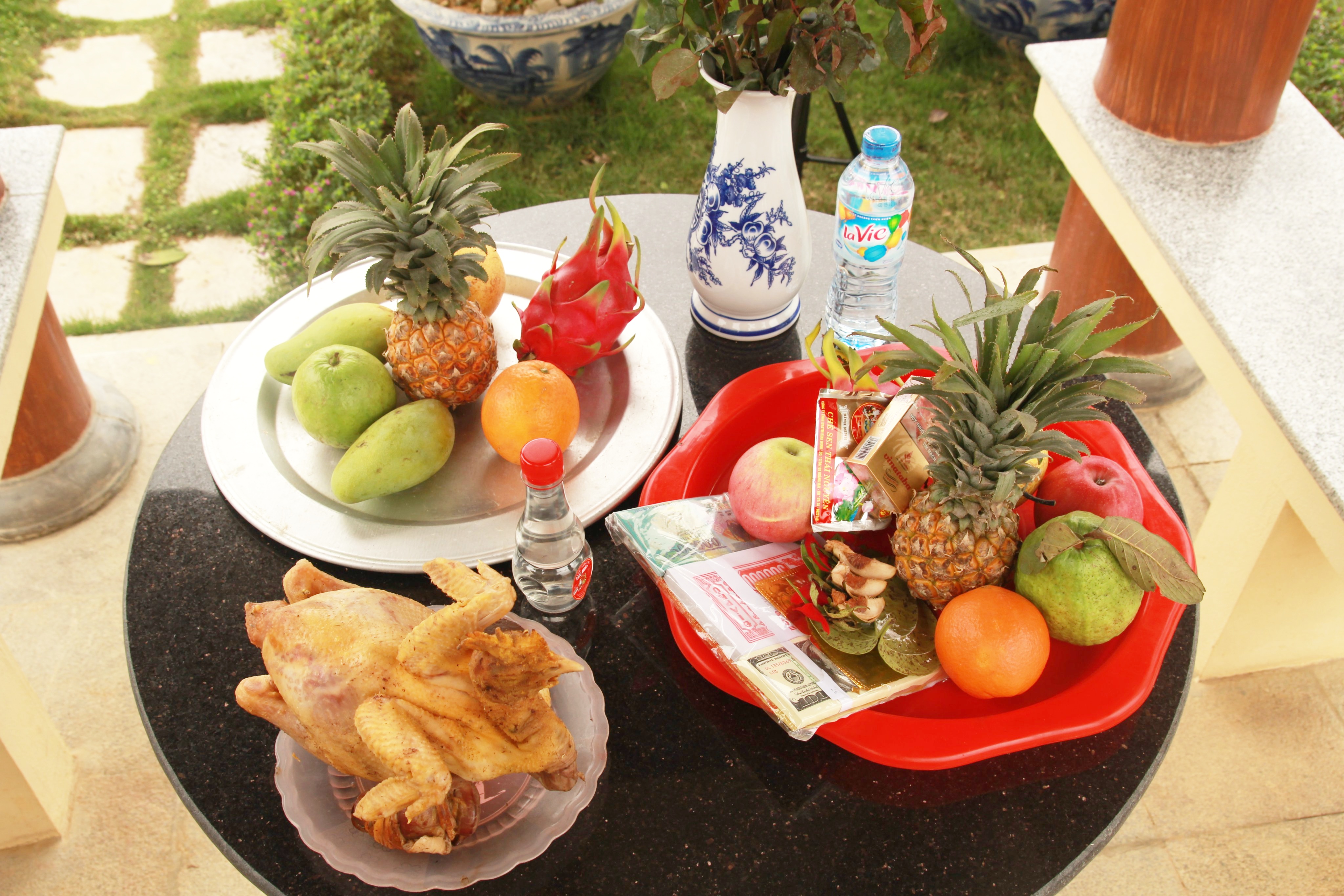 Một mâm lễ cúng với các món chay dâng tổ tiên được một gia đình lựa chọn bằng hình thức online.