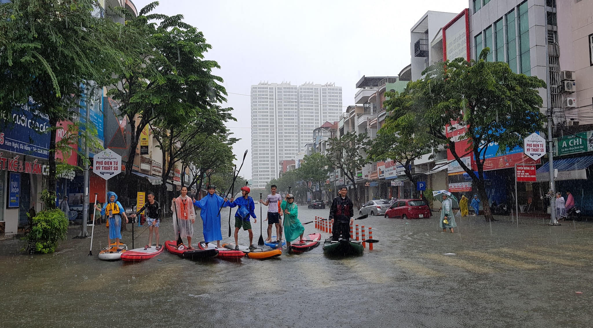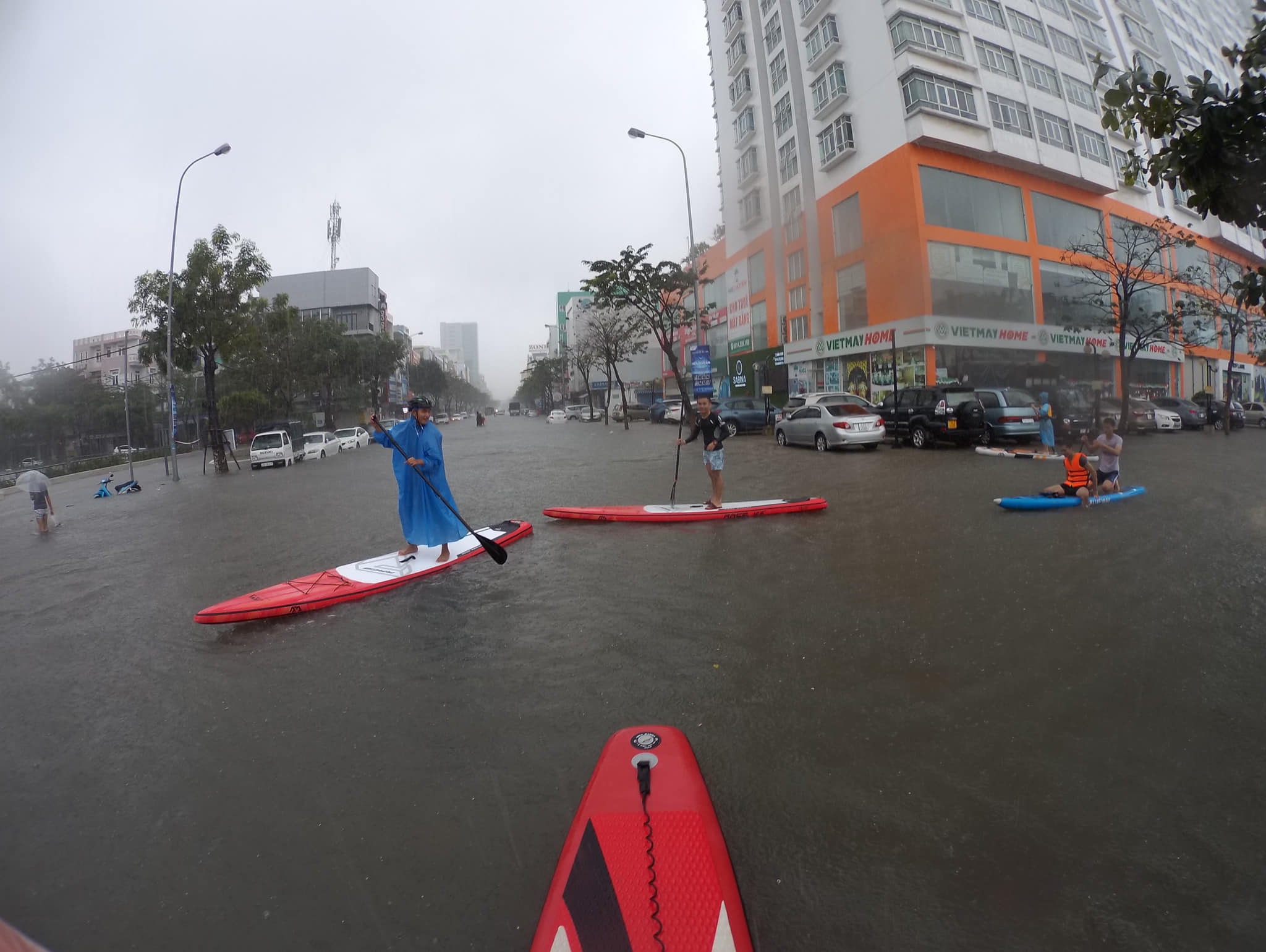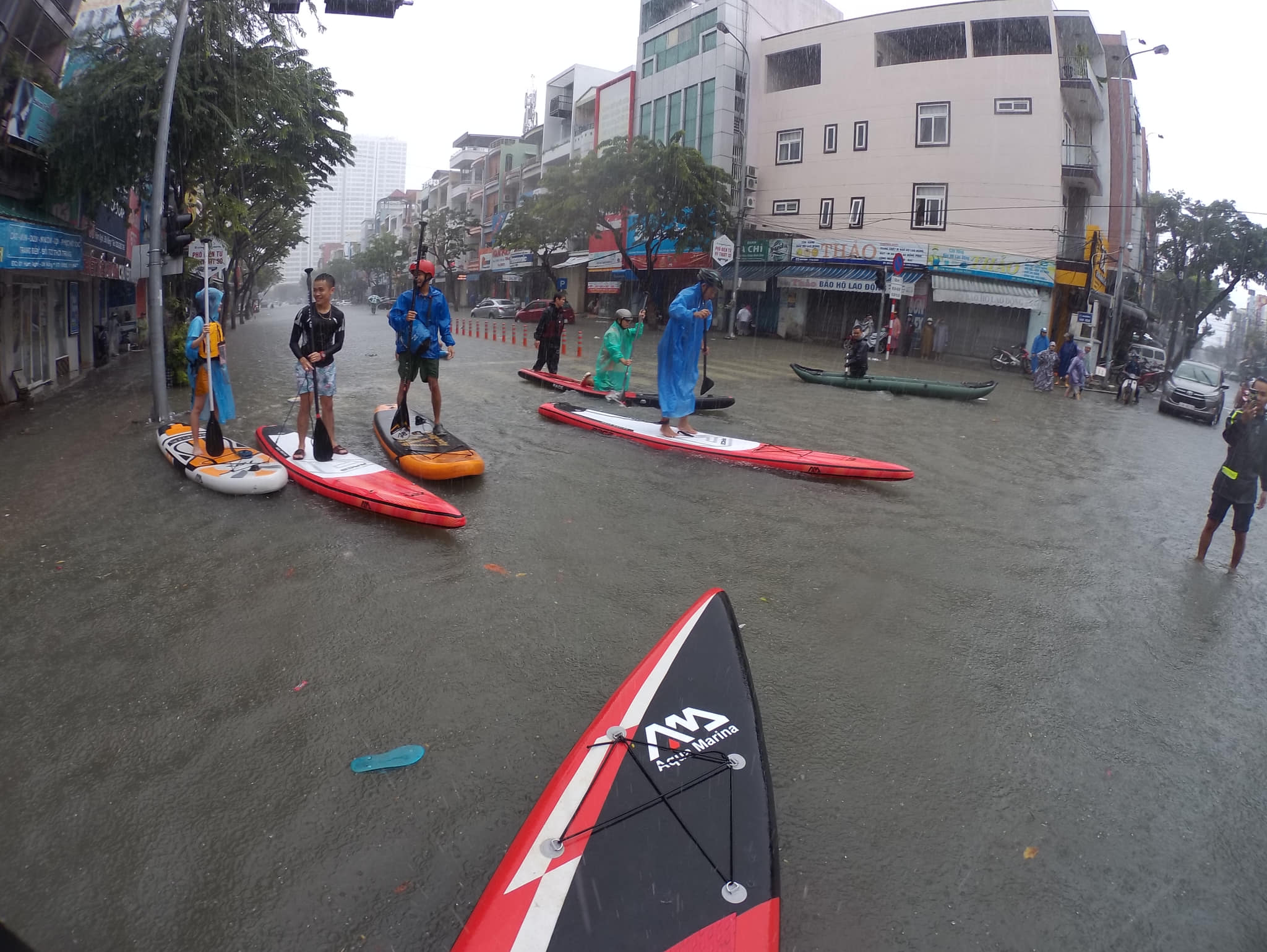 Đáng chú ý, giữa lúc trời mưa bão khiến tất cả mọi người đều e ngại nếu có việc phải ra đường thì mới đây, hình ảnh một nhóm người chơi môn thể thao SUP (Stand up paddle boarding hay còn gọi là lướt ván đứng) đã mang thuyền và lướt sóng ngay trên trục đường ở TP. Đà Nẵng gây chú ý cộng đồng mạng.