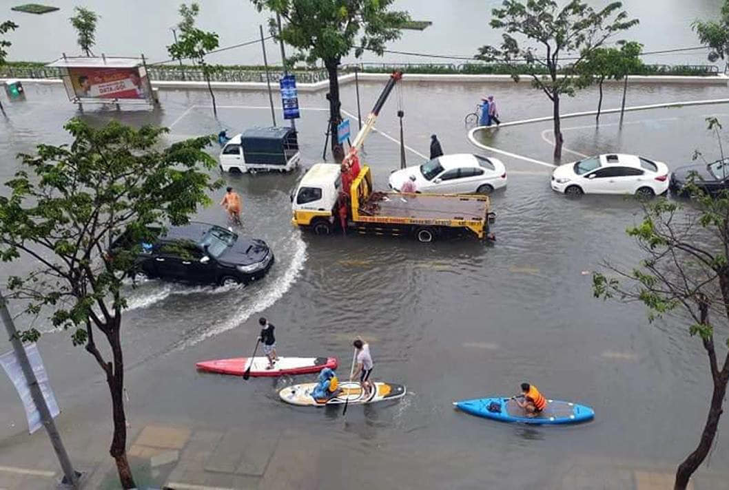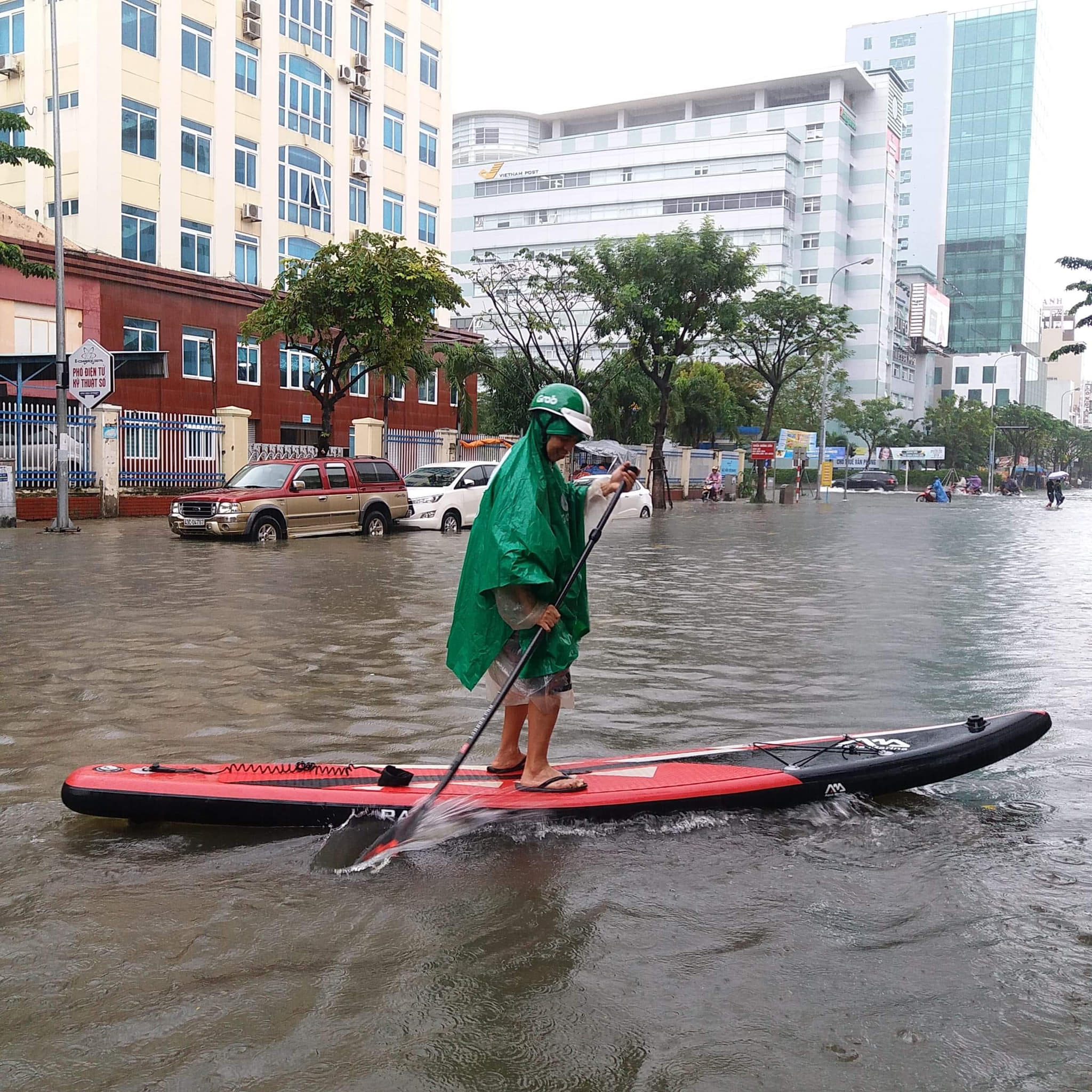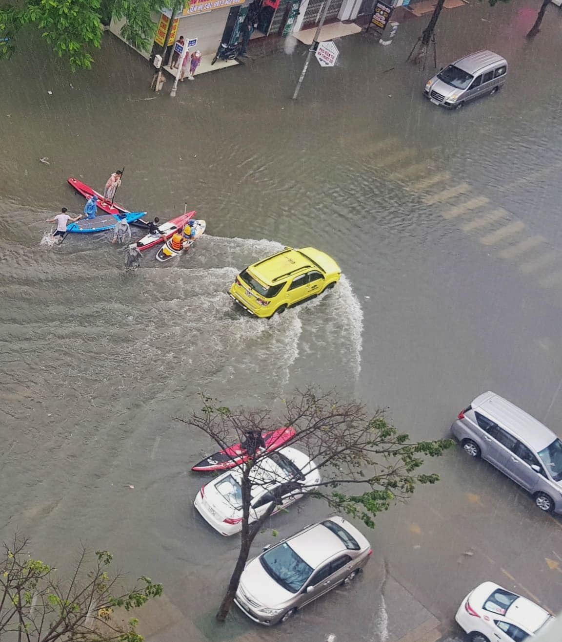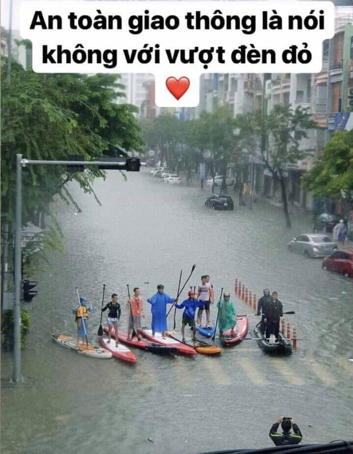 Đáng chú ý, giữa lúc trời mưa bão khiến tất cả mọi người đều e ngại nếu có việc phải ra đường thì mới đây, hình ảnh một nhóm người chơi môn thể thao SUP (Stand up paddle boarding hay còn gọi là lướt ván đứng) đã mang thuyền và lướt sóng ngay trên trục đường ở TP. Đà Nẵng gây chú ý cộng đồng mạng.
