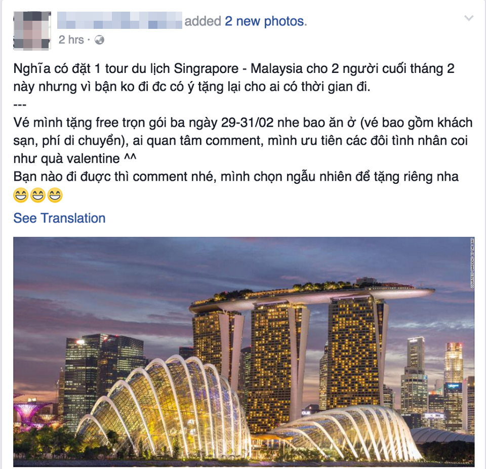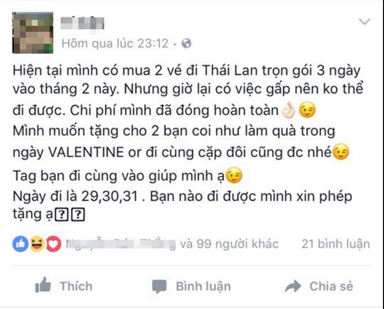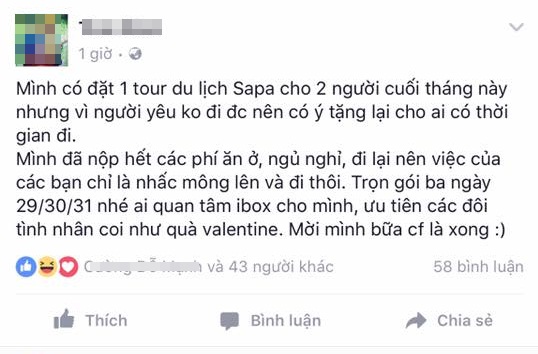 “Mình có đặt một tour du lịch Sapa cho 2 người cuối tháng này nhưng vì người yêu không đi được nên có ý tặng lại cho ai có thời gian đi. Mình đã nộp hết các phí ăn ở, ngủ nghỉ, đi lại nên việc của các bạn chỉ là nhấc mông lên và đi thôi. Trọn gói ba ngày 29/30/31 nhé ai quan tâm inbox cho mình, ưu tiên các đôi tình nhân coi như quà Valentine. Mời mình bữa cafe là xong”