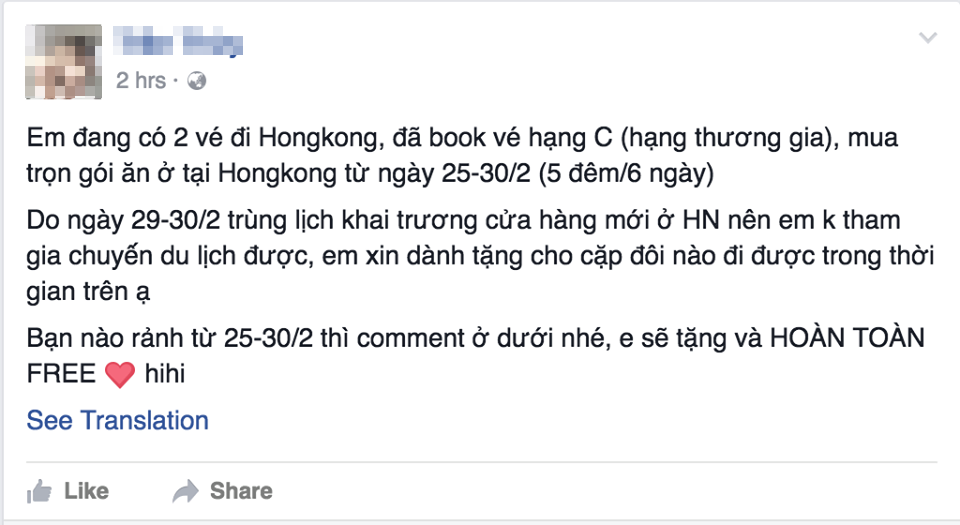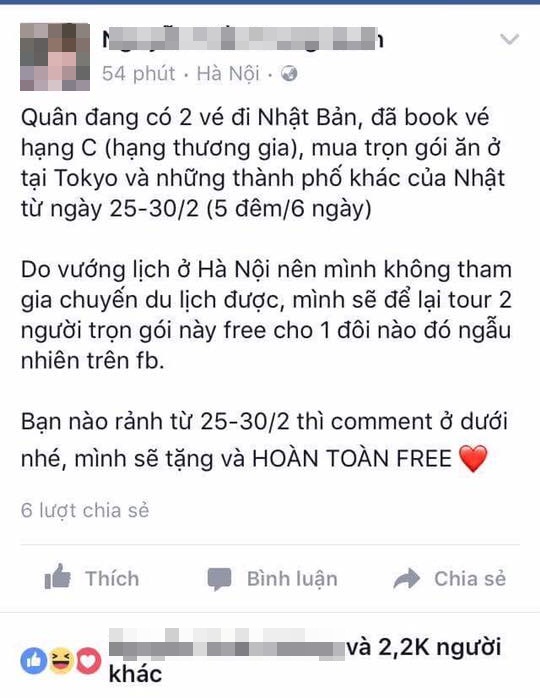 “Quân đang có 2 vé đi Nhật Bản, đã book vé hạng C (hạng thương gia), mua trọn gói ăn ở tại Tokyo và những thành phố khác của Nhật từ ngày 25-30/2 (5 đêm/6 ngày). Do vướng lịch ở Hà Nội nên mình không tham gia chuyến du lịch được, mình sẽ để lại tour 2 người trọn gói này free cho 1 đôi nào đó ngẫu nhiên trên facebook. Bạn nào rảnh từ 25 đến 30/2 thì comment ở dưới nhé, mình sẽ tặng và HOÀN TOÀN FREE.”