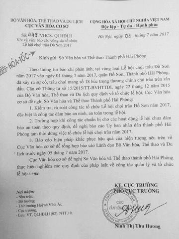 Công văn do bà Ninh Thị Thu Hương, Cục phó Cục Văn hóa cơ sở, ký chiều 1/7 nêu rõ theo thông tin báo chí phản ánh, tại vòng loại lễ hội chọi trâu Đồ Sơn năm 2017 vào ngày 1/7 tại Đồ Sơn (Hải Phòng) đã xảy ra sự cố, trâu chọi mang số 18 húc trọng thương chính chủ trâu trên sân đấu. Nạn nhân sau đó đã qua đời.