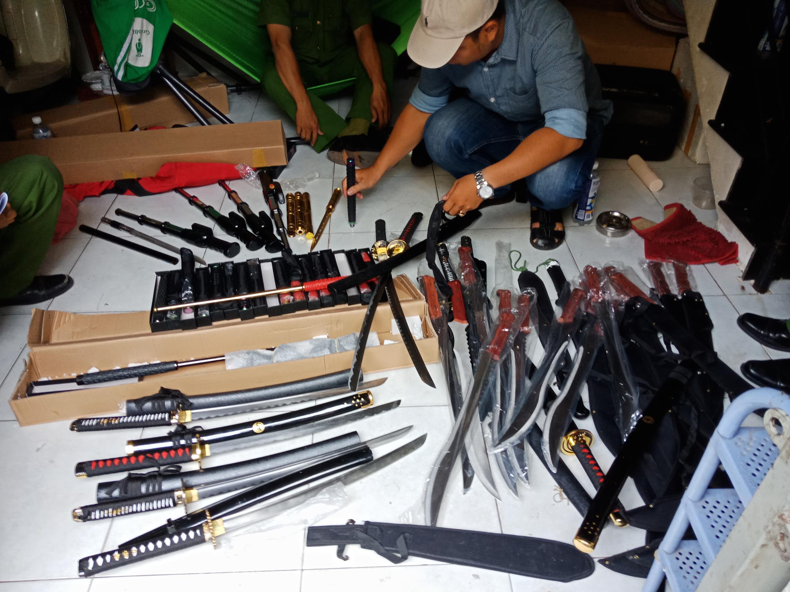 Tại đây, Công an phát hiện “kho” hung khí gồm: hàng trăm kiếm Nhật, đao, mã tấu, roi điện… các loại. Lực lượng chức năng tiến hành thu giữ số tang vật nói trên.
