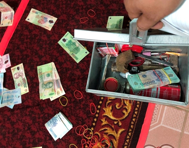 Đến 15 giờ 30 phút cùng ngày, lực lượng phối hợp bất ngờ ập vào kiểm tra nhà của Phạm Thị Vinh, bắt quả tang 18 đối tượng đang cờ bạc dưới hình thức xóc đĩa ăn tiền. Kiểm tra hiện trường, cơ quan Công an thu giữ: hơn 12 triệu đồng trên chiếu bạc, 50 triệu đồng trong thùng, 1 bộ bát đĩa sứ và 4 quân vị, 1 bộ dụng cụ đột quân vị (búa, thanh đột), một xe ô tô 29 chỗ BKS 14B-032.72, ghế nhựa cùng một số tang vật khác có liên quan.