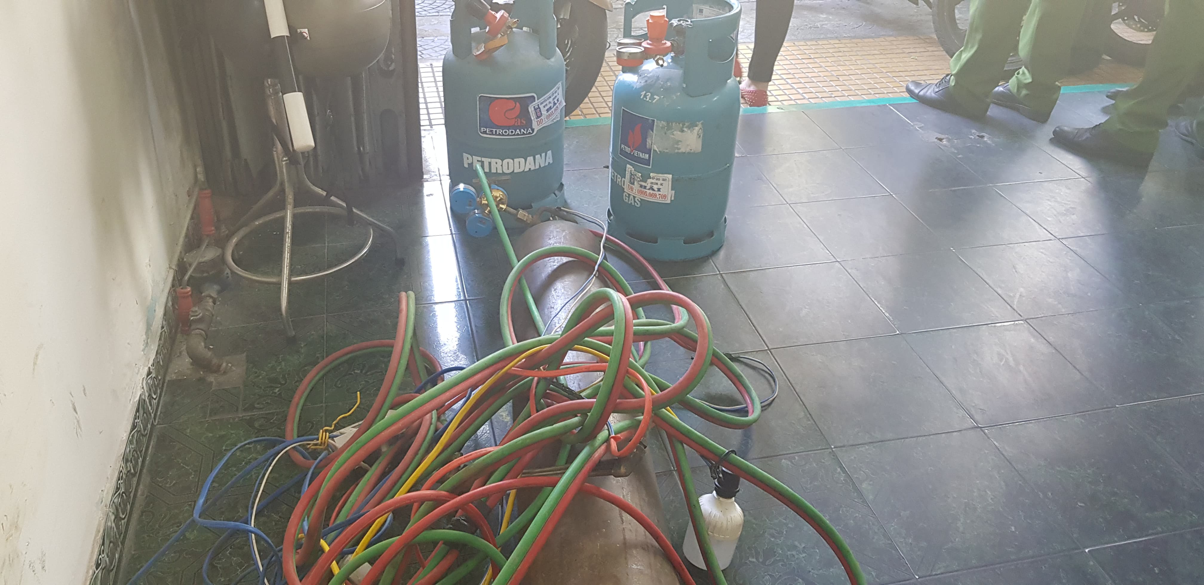 2 bình ga và 1 bình hàn gió đá của 2 công nhân bị công an lập biên bản tạm giữ. Ảnh: Nam Ca