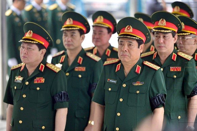 Đại tướng Ngô Xuân Lịch (Bộ trưởng Quốc phòng) cùng đại tướng Phùng Quang Thanh (nguyên Bộ trưởng Quốc phòng) dẫn đầu đoàn của Bộ Quốc phòng vào viếng 9 quân nhân phi hành đoàn chiếc CASA số hiệu 8983. Ảnh: Lê Hiếu.