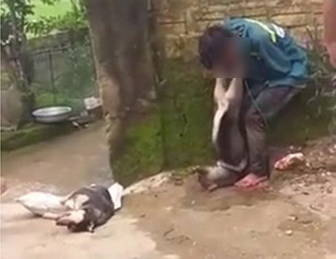 Chạy được một đoạn, Quyết bị người dân vây bắt. Quá bức xúc, người dân đã đánh hội đồng và trói thanh niên trộm chó này vào gốc cây bên đường rồi treo chó bị đánh bả lên trên cổ.