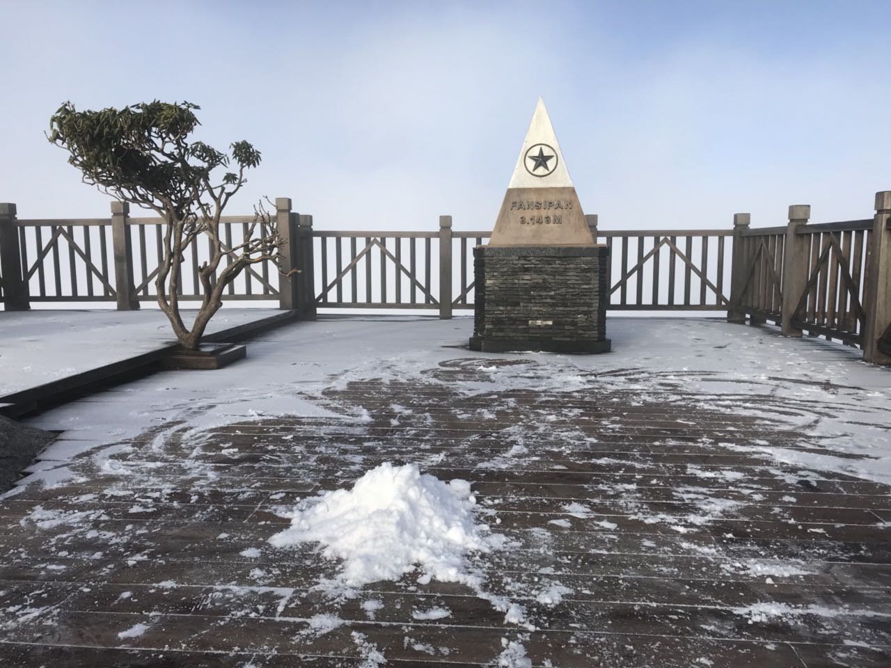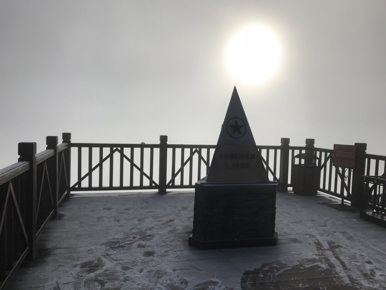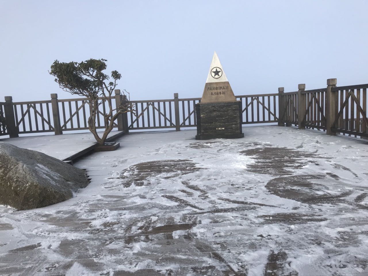 Sáng 17/1, trên đỉnh Fansipan xuất hiện lớp băng tuyết trắng xóa ước tính dày khoảng 7mm. Lớp băng tuyết phủ kín khu vực thềm bậc thang, chóp tháp tạo một lớp mỏng màu trắng vô cùng đẹp mắt.