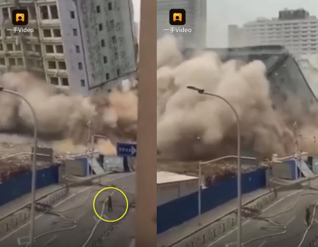 Đây hoàn toàn không phải một vụ khủng bố, hay thiên tai động đất mà đơn giản là một toà nhà cũ được phá huỷ để chuẩn bị xây dựng một dự án mới. Thế nhưng điều đáng nói ở đây là ngay khi toà nhà bị phá huỷ, rất đông xe cộ và người đi bộ vẫn ung dung di chuyển trong phạm vi nguy hiểm.