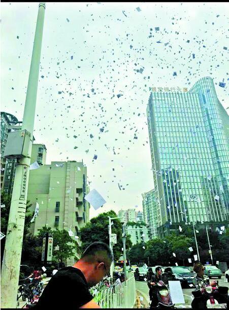 Sáng 11/5, phía trên toà nhà Tài chính Quốc tế IFC, thuộc quận Giang Hán (Vũ Hán, Trung Quốc) đã xuất hiện “cơn mưa tờ rơi”. Một người nào đó đã cố ý lên tầng thượng của toà nhà và rải hơn 5000 tờ quảng cáo xuống dưới. Uỷ ban quản lý quận Giang Hán đã phải triệu tập hơn 10 công nhân vệ sinh và phải mất 20 phút mới dọn sạch được những tờ rơi rải rác khắp đường.