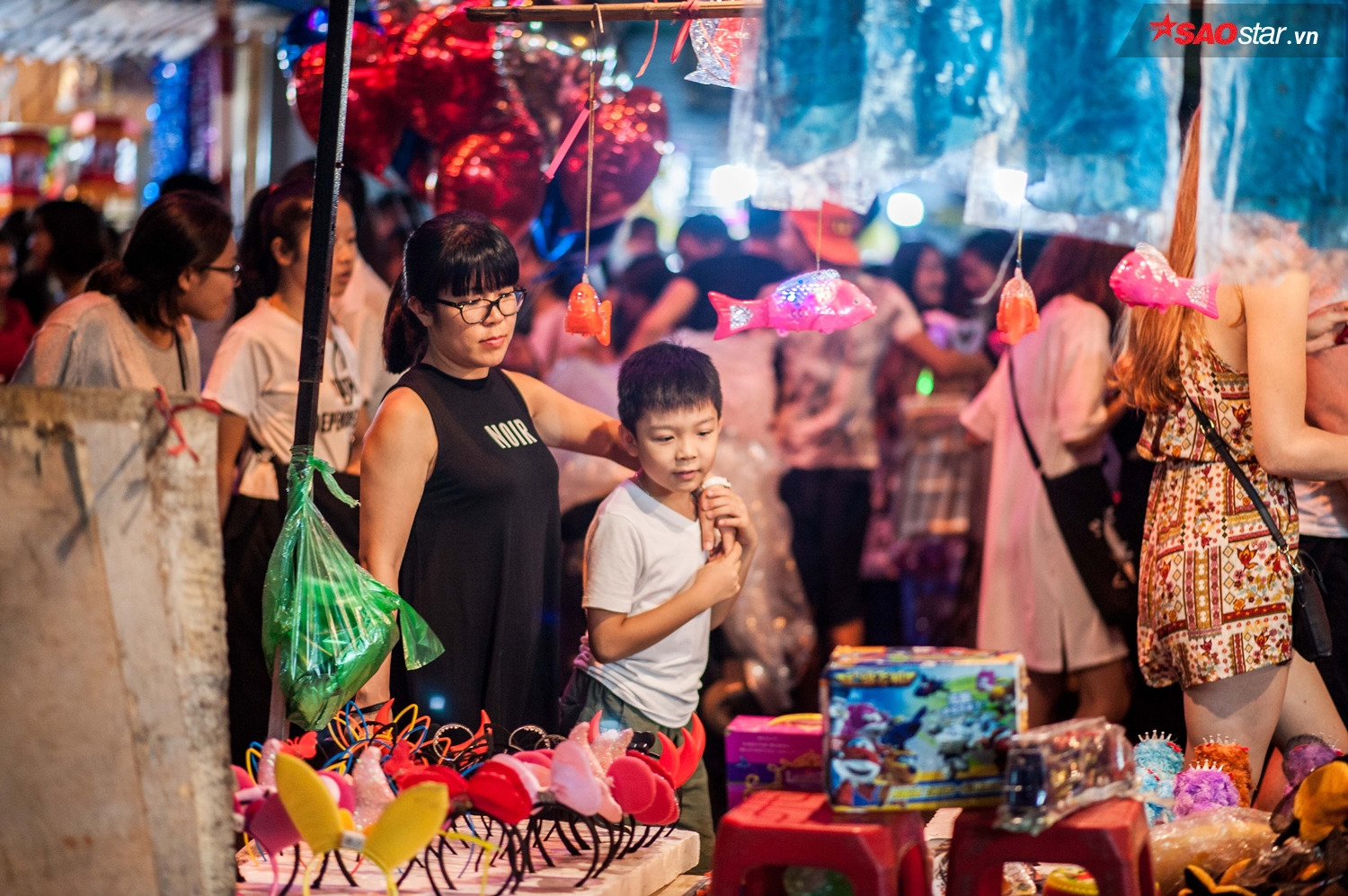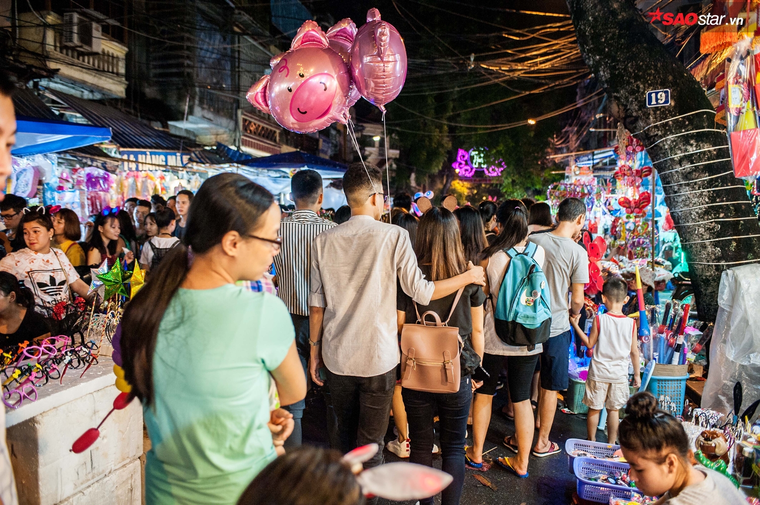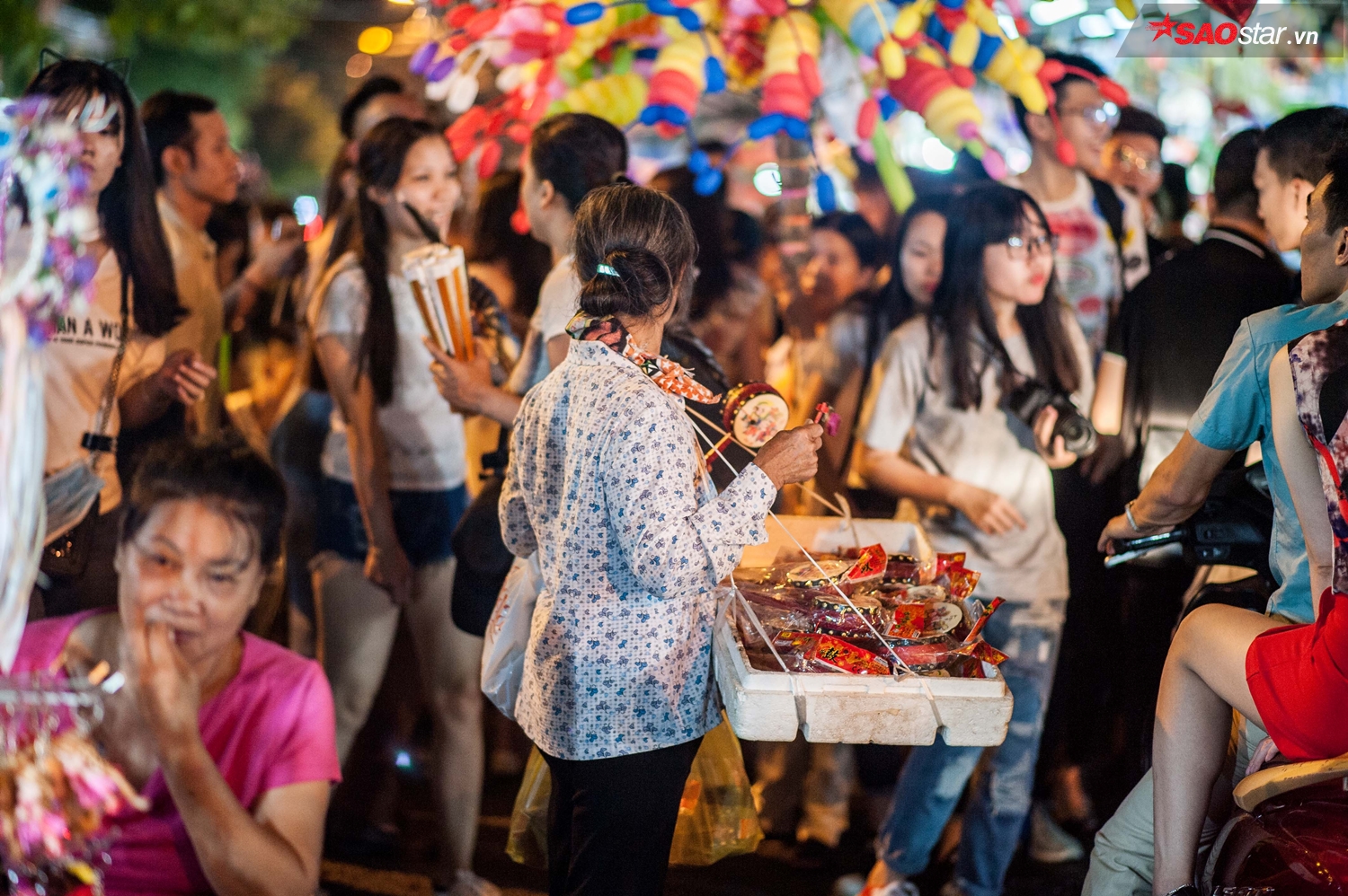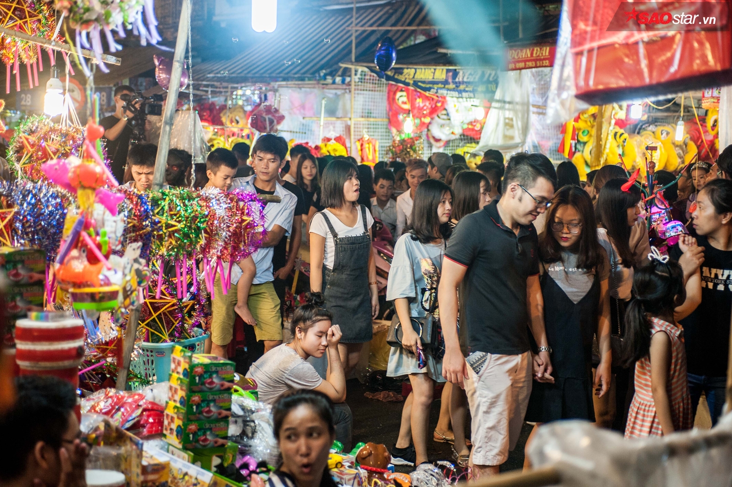 Ngoài việc buôn bán dọc 2 bên đường, nhiều tiểu thương còn tranh thủ, mở sạp bán hàng ngay giữa lòng đường. Vì thế, lối đi cho du khách bị thu hẹp dẫn đến cảnh chen chúc, đùn đẩy nhau. Đi chơi Trung thu nhưng nhiều người không khỏi toát mồ hôi, phần vì mệt mỏi, phần vì chán nản do không còn hơi sức đâu để chụp ảnh hay ngắm nhìn các loại đèn lồng hay đồ chơi.