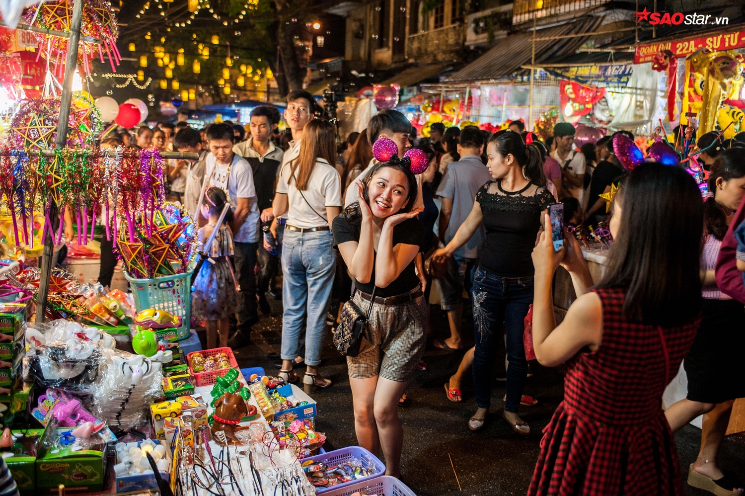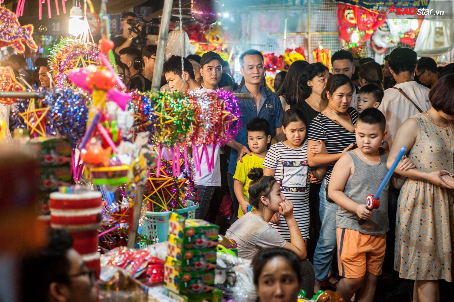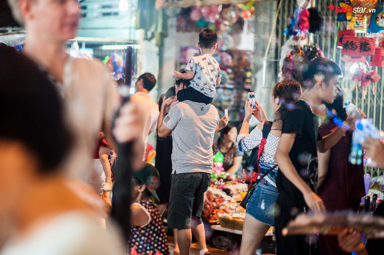 Ngoài việc buôn bán dọc 2 bên đường, nhiều tiểu thương còn tranh thủ, mở sạp bán hàng ngay giữa lòng đường. Vì thế, lối đi cho du khách bị thu hẹp dẫn đến cảnh chen chúc, đùn đẩy nhau. Đi chơi Trung thu nhưng nhiều người không khỏi toát mồ hôi, phần vì mệt mỏi, phần vì chán nản do không còn hơi sức đâu để chụp ảnh hay ngắm nhìn các loại đèn lồng hay đồ chơi.