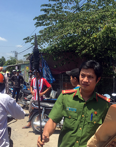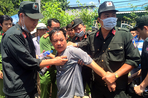Sau nhiều giờ thuyết phục bất thành, đến 12h, hàng chục cảnh sát thuộc Công an huyện Trà Ôn và Công an tỉnh Vĩnh Long được lệnh phá cửa, xông vào xịt hơi cay, khống chế nghi can.