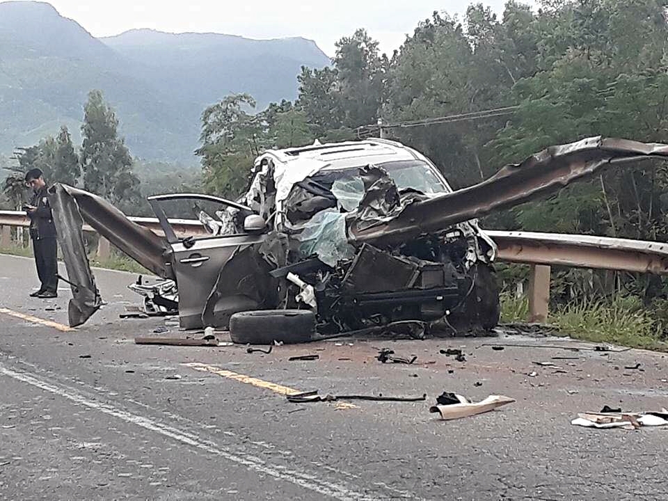 Tại hiện trường, chiếc ôtô bị biến dạng, kính vỡ tung khắp nơi, thanh hộ lan đường cắm xiên vào đầu ôtô…