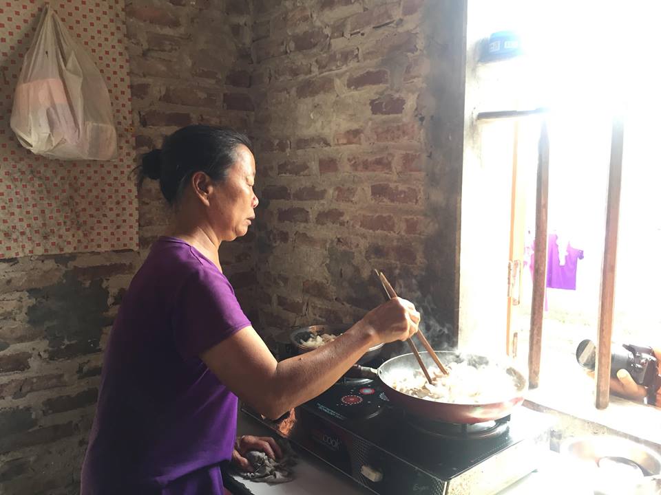 Bà Thức đang rang thịt chuẩn bị đồ lên thăm con trai.