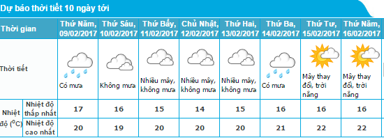Do ảnh hưởng của không khí lạnh, ở Bắc Bộ có mưa, mưa rào rải rác và có nơi có dông. Các tỉnh ven biển Trung Bộ từ ngày 9/2 có mưa, có nơi mưa vừa, mưa to. Gió trong đất liền chuyển hướng đông bắc cấp 2-3, vùng ven biển cấp 3-4. Từ ngày 9/2, ở các tỉnh Bắc Bộ và Bắc Trung Bộ trời chuyển rét, vùng núi phía Bắc trời rét đậm với nhiệt độ thấp nhất phổ biến 13-16 độ C, vùng núi 10-13 độ C, vùng núi cao dưới 10 độ C.