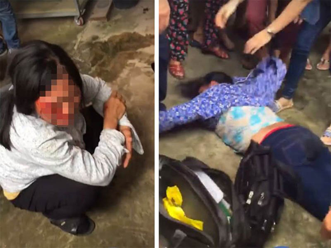 Ảnh cắt từ clip hai người phụ nữ bị đánh dã man vì nghi bắt cóc trẻ em ở Sóc Sơn.