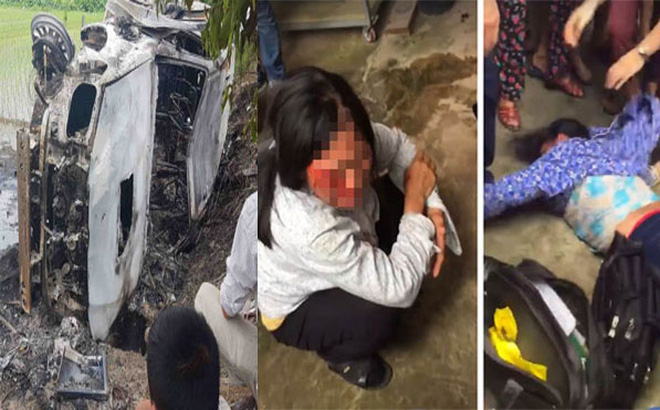 Ảnh chiếc xe bị đốt ở Hải Dương và hai người phụ nữ bị đánh ở Sóc Sơn.