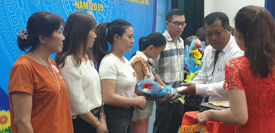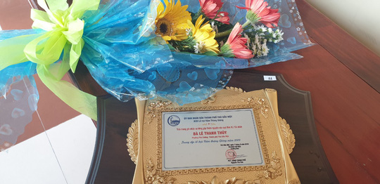 Bà Thủy (thứ tư từ trái sang), vợ ông Toàn, được tuyên dương vì công tác thiện nguyện