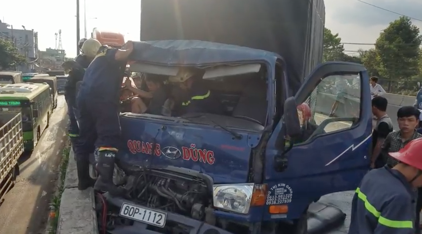Vụ việc làm đầu xe tải biến dạng, nam thanh niên bị thương nặng mắc kẹt trong cabin.
