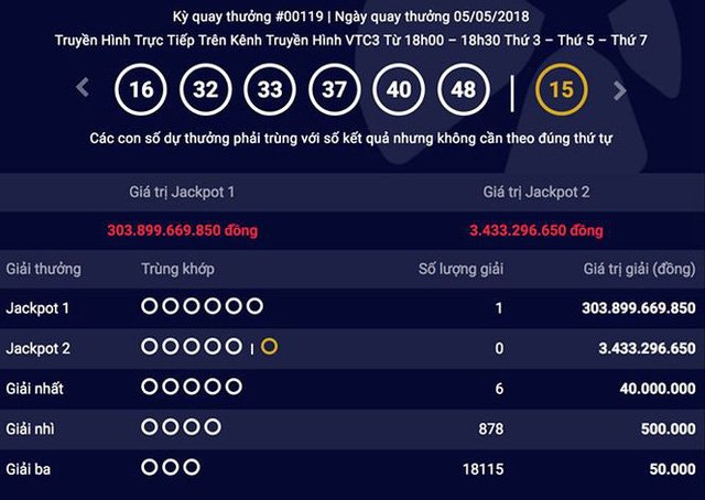 Kỳ quay số mở thưởng 119 diễn ra tối 5/5 đã xác định bộ số trúng thưởng Jackpot 1 là 16-32-33-37-40-48 với giải thưởng trị giá hơn 303,8 tỷ đồng (chưa trừ thuế).