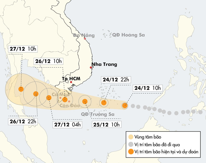 Nghĩa là dù bão có đổ bộ vào Cà Mau thì vùng gió mạnh vẫn ảnh hưởng đến tận Nam Bình Thuận, Vũng Tàu, kể cả khi bão giảm cấp khi đến Trường Sa rồi vào bờ, thì mây bão tan nhanh cũng sẽ gây nên mưa lớn với lượng 150-200mm từ đêm 25 đến hết ngày 26.12. Bão cũng có thể gây sóng cao đến 10m ở khu vực Trường Sa, ngoài khơi Bình Thuận đến Cà Mau.