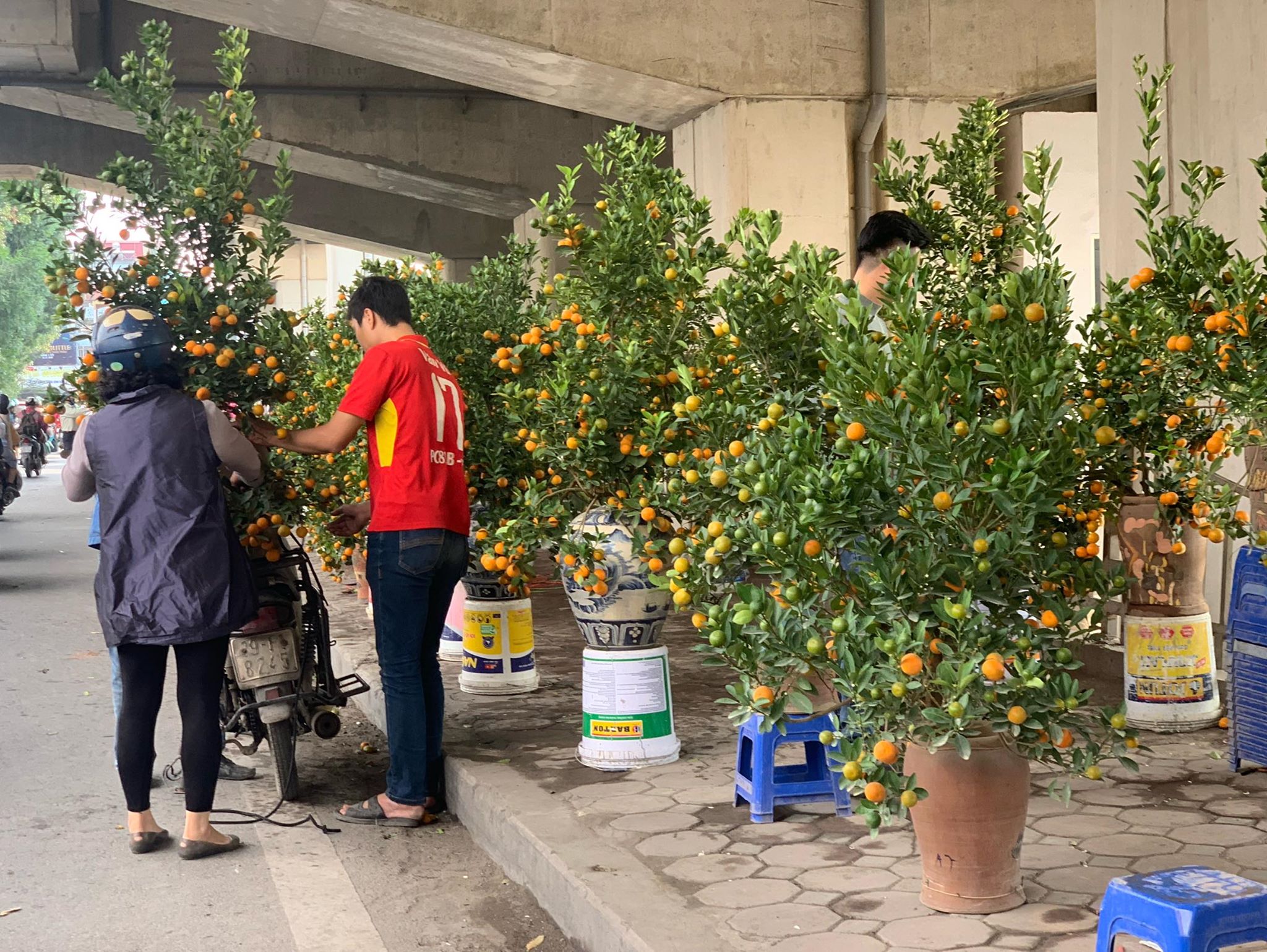 Bên phía mặt phố Cát Linh, các chậu quất cảnh được xếp san sát từ trong gầm nhà ga ra đến vỉa hè.