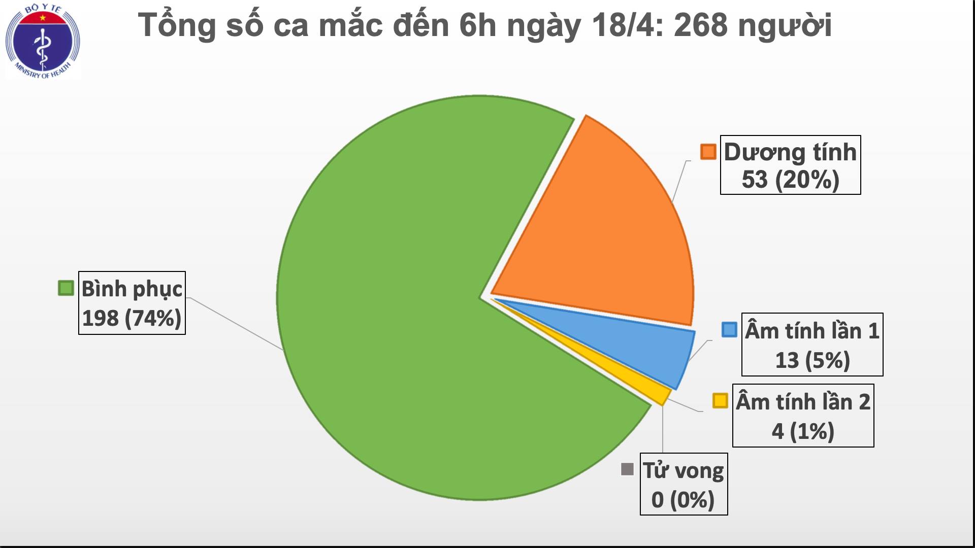 Thông tin từ Ban chỉ đạo quốc gia phòng, chống dịch COVID-19, tính đến 6h ngày 18/4 cả nước ghi nhận 268 ca dương tính với SARS-CoV-2. Đặc biệt, Việt Nam không ghi nhận thêm ca nhiễm COVID-19 mới trong 48 giờ qua.