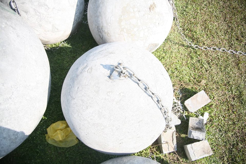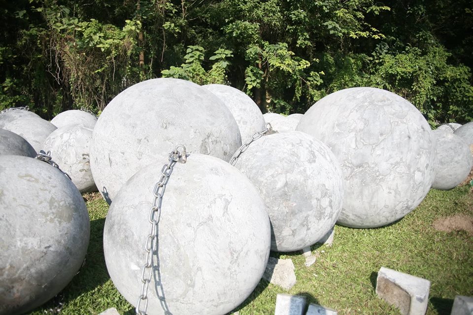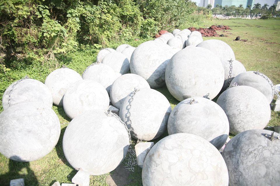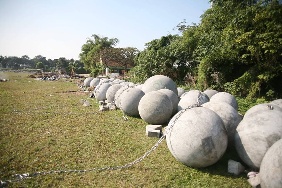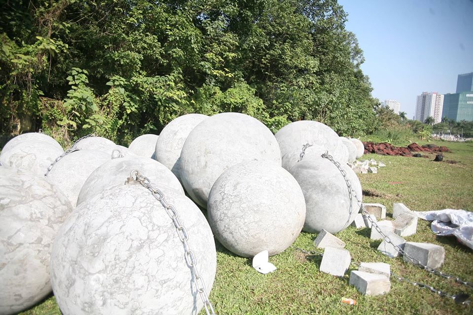 Hiện 40 quả bóng xích vẫn vẫn nằm yên vị tại bãi đất trống cạnh Sân vận động Mỹ Đình sau khi được di chuyển.
