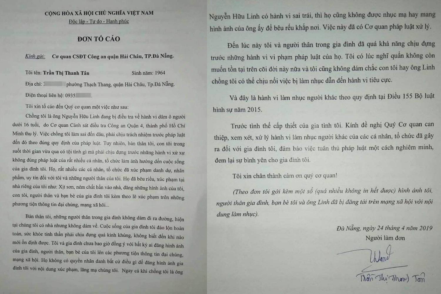 Đơn tố cáo của vợ ông Nguyễn Hữu Linh.