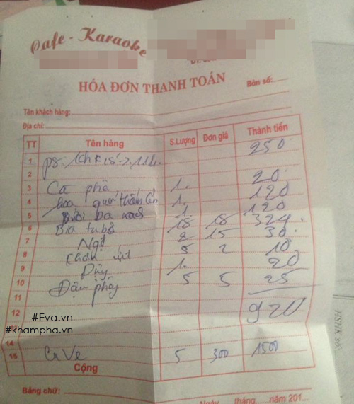 Đây sẽ là một tờ hóa đơn bình thường với phần ghi chi tiết thời gian hát, cà phê, hoa quả, khăn ướt, đậu phộng… với tổng giá tiền là 920.000 đồng. Tuy nhiên, ở dòng cuối cùng lại có ghi chữ “cave”, số lượng 5, đơn giá 300 (300.000 đồng), thành tiền 1500 (1,5 triệu đồng).