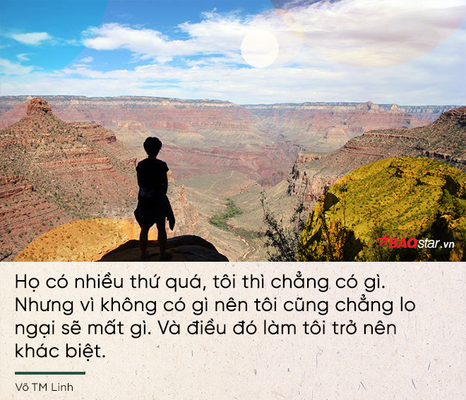 - Những bạn cùng đạt học bổng với tôi rất tài năng. Nhưng tất cả họ đều na ná giống nhau, thành tích học tập giỏi, kinh nghiệm làm việc lâu năm và là lãnh đạo của các tổ chức có uy tín. Họ có nhiều thứ quá, tôi thì chẳng có gì. Nhưng vì không có gì nên tôi cũng chẳng lo ngại sẽ mất gì. Và điều đó làm tôi trở nên khác biệt.