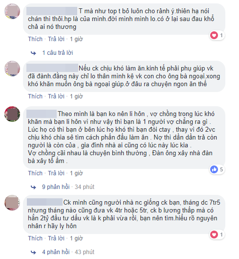 Bên đồng cảm ủng hộ bà mẹ trẻ ly hôn thì cũng lắm lý do thuyết phục không kém: “Làm công chức lương 7 triệu bạc, nhà bố mẹ đẻ thì không điều kiện, anh ta lấy đâu ra số tiền lớn thế mà hùn vốn làm ăn? Mẹ nó phải tìm hiểu rõ ràng nhé”; “Nếu làm ăn thua lỗ từ đầu thì bỏ từ lúc lỗ ít đi, buôn bán gì để nợ ngần ấy tiền rồi về nhà hạch sách vợ, cáu gắt nọ kia, phải mình thì bỏ luôn từ lâu rồi”; “Mình không có trách nhiệm phải bán máu trả nợ cho chồng đâu chị ạ, bế con về nhà ngoại cho thoải mái đầu óc”…