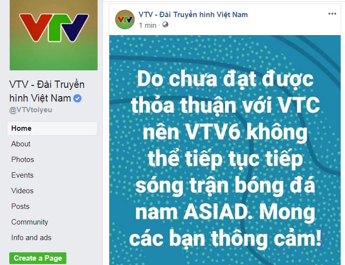 Ngoài ra, trên fanpage của VTV đã chính thức đăng thông báo giải thích sự cố: “Do chưa đạt được thỏa thuận với VOV nên VTV6 không thể tiếp tục tiếp sóng trận bóng đá nam ASIAD. Mong các bạn thông cảm!”.