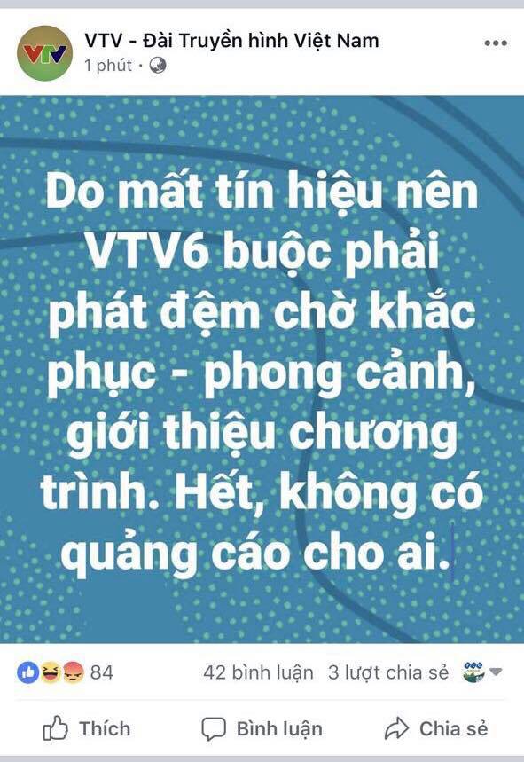 Sau đó ít phút khi bước vào hiệp 2, trên fanpage của VTV đăng tải thêm một thông báo khác với nội dung: “Do mất tín hiệu, nên VTV6 buộc phải phát đệm chờ khắc phục bằng các video phong cảnh, giới thiệu chương trình”.