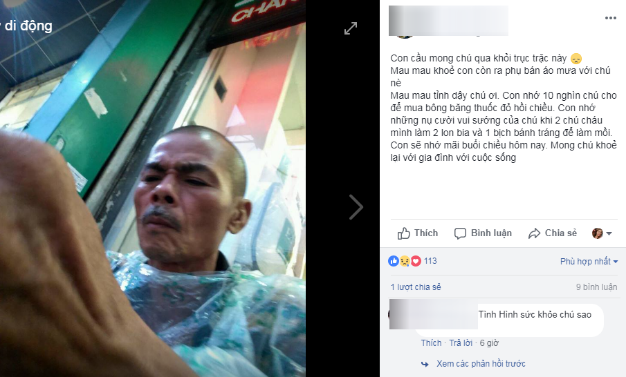 Thành viên N.M.H bày tỏ: “Con cầu mong chú qua khỏi trục trặc này. Mau mau khoẻ con còn ra phụ bán áo mưa với chú nè. Mau mau tỉnh dậy chú ơi. Con nhớ 10 nghìn chú cho để mua bông băng thuốc đỏ hồi chiều. Con nhớ những nụ cười vui sướng của chú khi 2 chú cháu mình làm 2 lon bia và 1 bịch bánh tráng để làm mồi. Con sẽ nhớ mãi buổi chiều hôm nay. Mong chú khoẻ lại với gia đình với cuộc sống”.