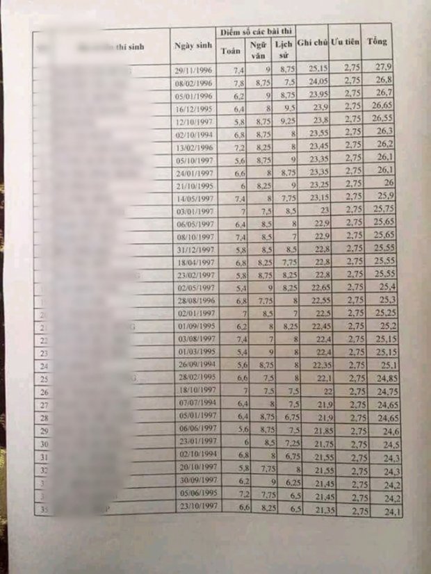 Theo bảng điểm được đăng tải này, có đủ danh sách tên, tuổi, ngày tháng năm sinh và số điểm 3 môn (Toán, Văn, Lịch Sử) với số lượng điểm trên 8 và 9 tại hai môn Ngữ Văn và Lịch sử cao đột biến.