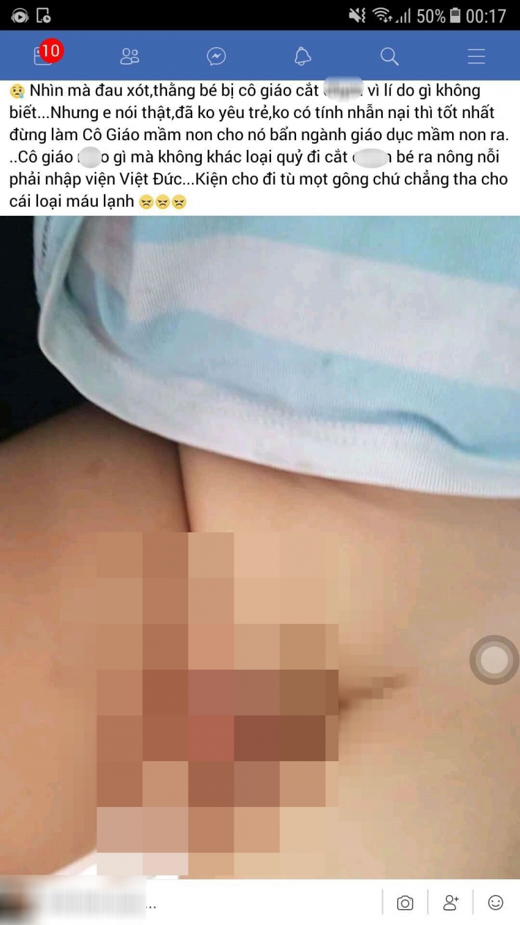 Trước đó, trên mạng xã hội facebook chia sẻ đoạn clip bé Minh C. được gia đình cho đi nhà trẻ tư thục ở xã Tiền Phong (huyện Thường Tín, Hà Nội), sau khi đón về nhà thì phát hiện cháu bé bị đứt vùng kín và phải khâu nhiều mũi khiến dư luận xôn xao.