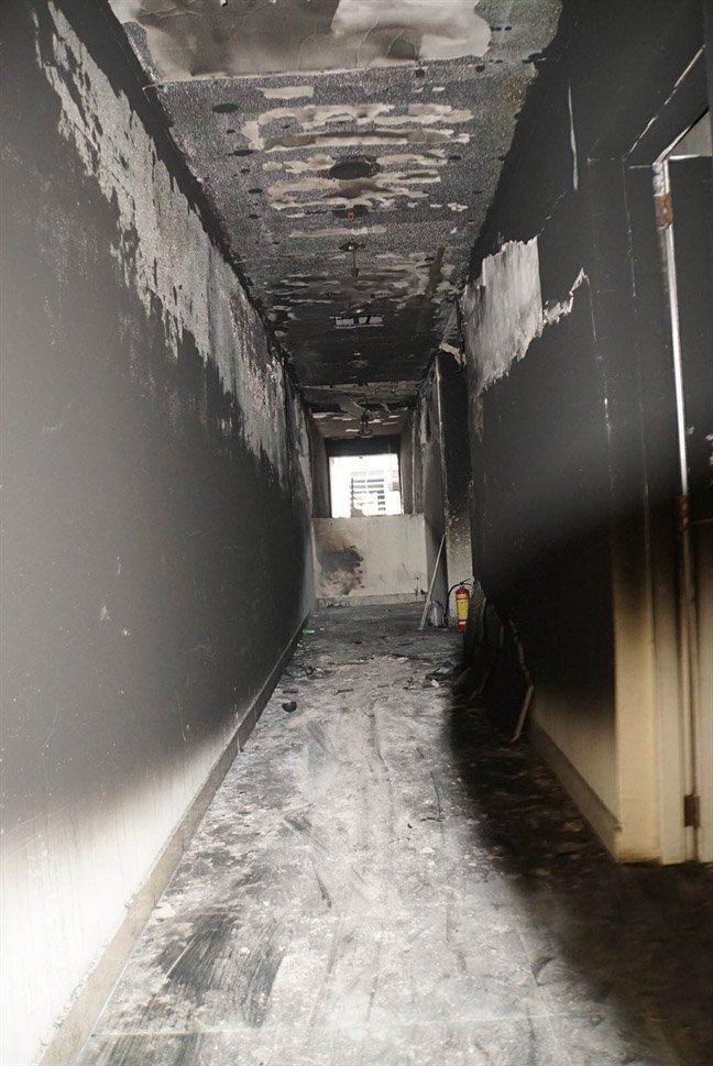 Hành lang tầng trệt chung cư Carina ám khói đen, nhiều mảng tường bị sức nóng khủng khiếp vụ cháy làm biến dạng, rơi vỡ